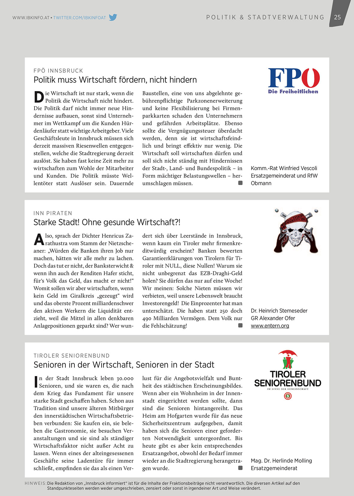 H i n W e i s : Die redaktion von „innsbruck informiert“ ist für die inhalte der fraktionsbeiträge nicht verantwortlich. Die diversen artikel auf den