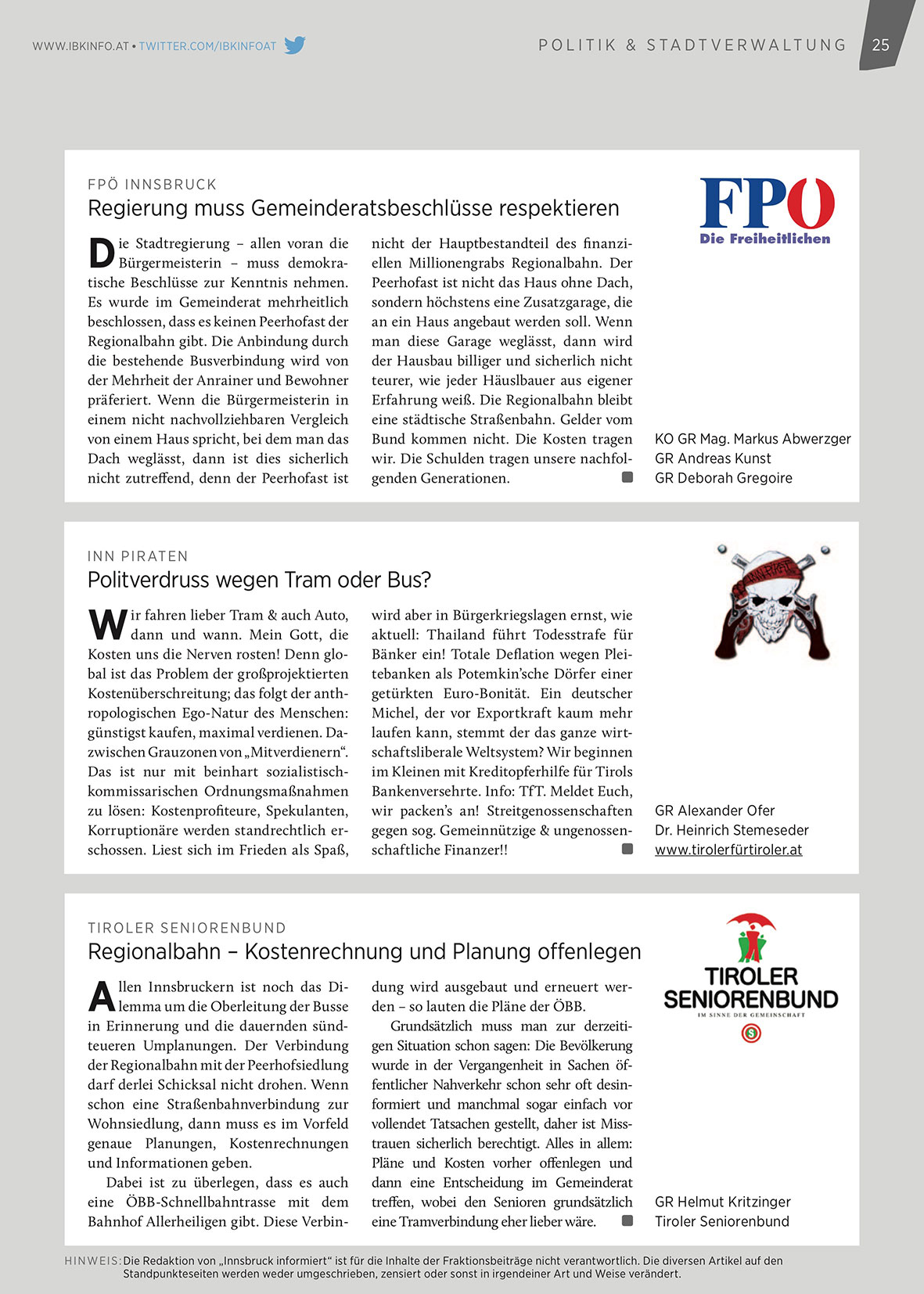 h i n W e i s : die redaktion von „innsbruck informiert“ ist für die inhalte der fraktionsbeiträge nicht verantwortlich. die diversen artikel auf den