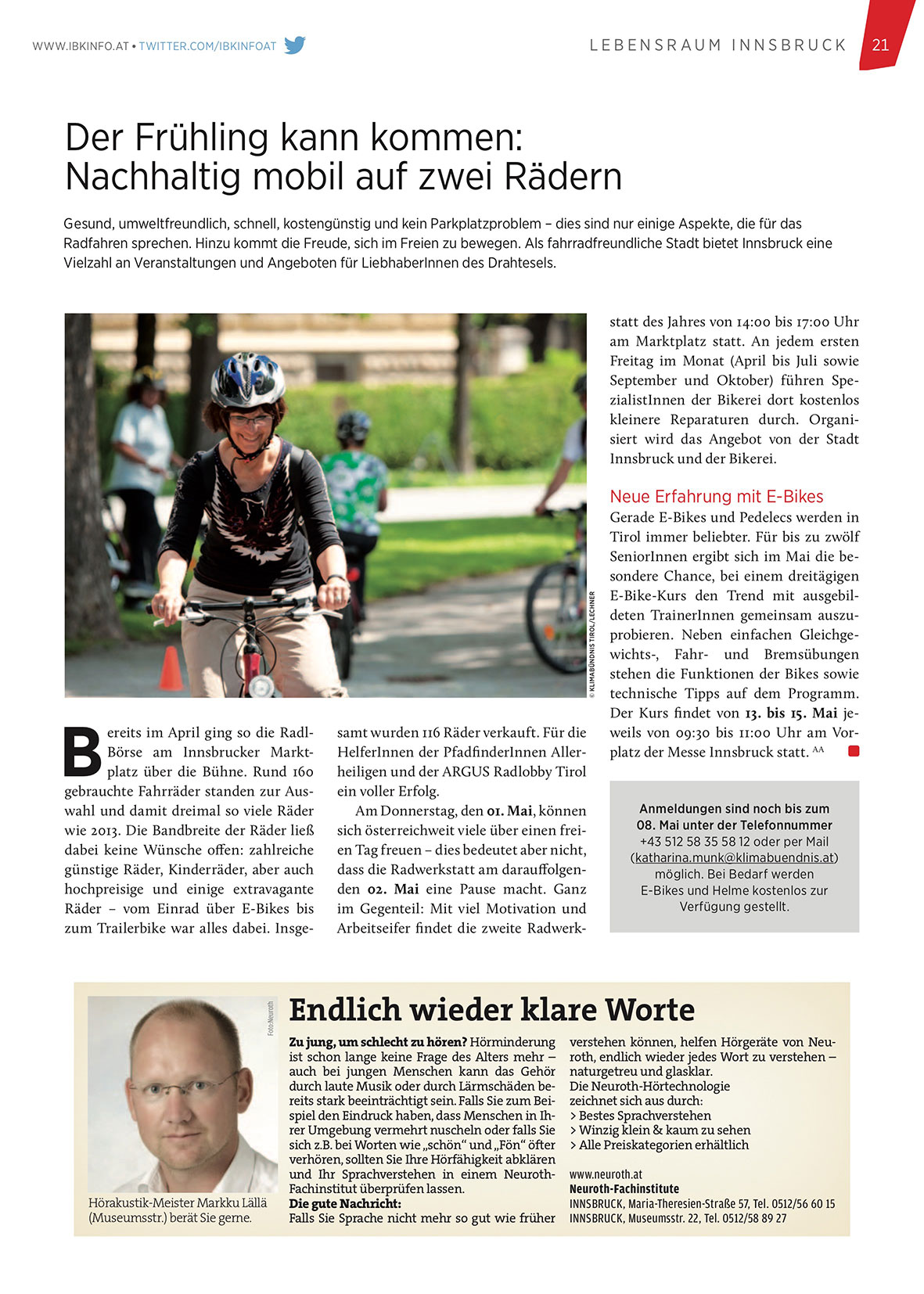 Radfahren sprechen. Hinzu kommt die Freude, sich im Freien zu bewegen. Als fahrradfreundliche Stadt bietet Innsbruck eine