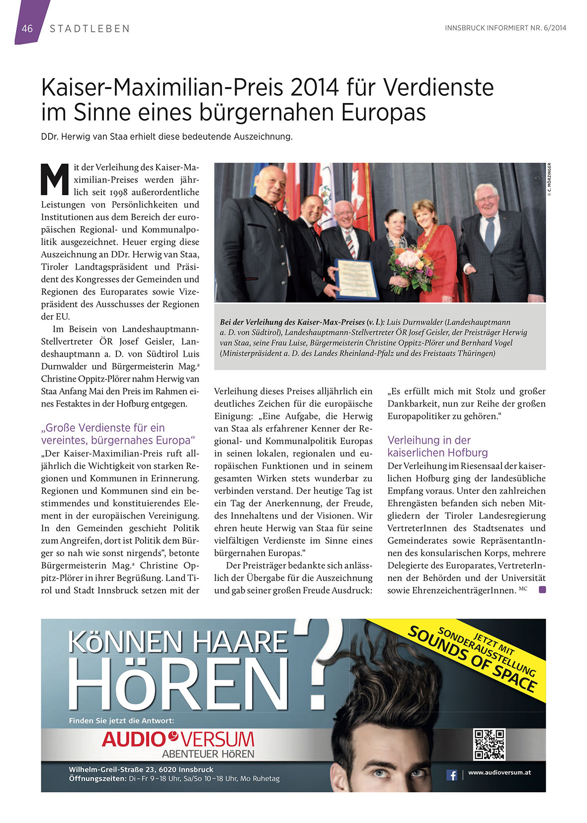 Kaiser-Maximilian-Preis 2014 für Verdienste