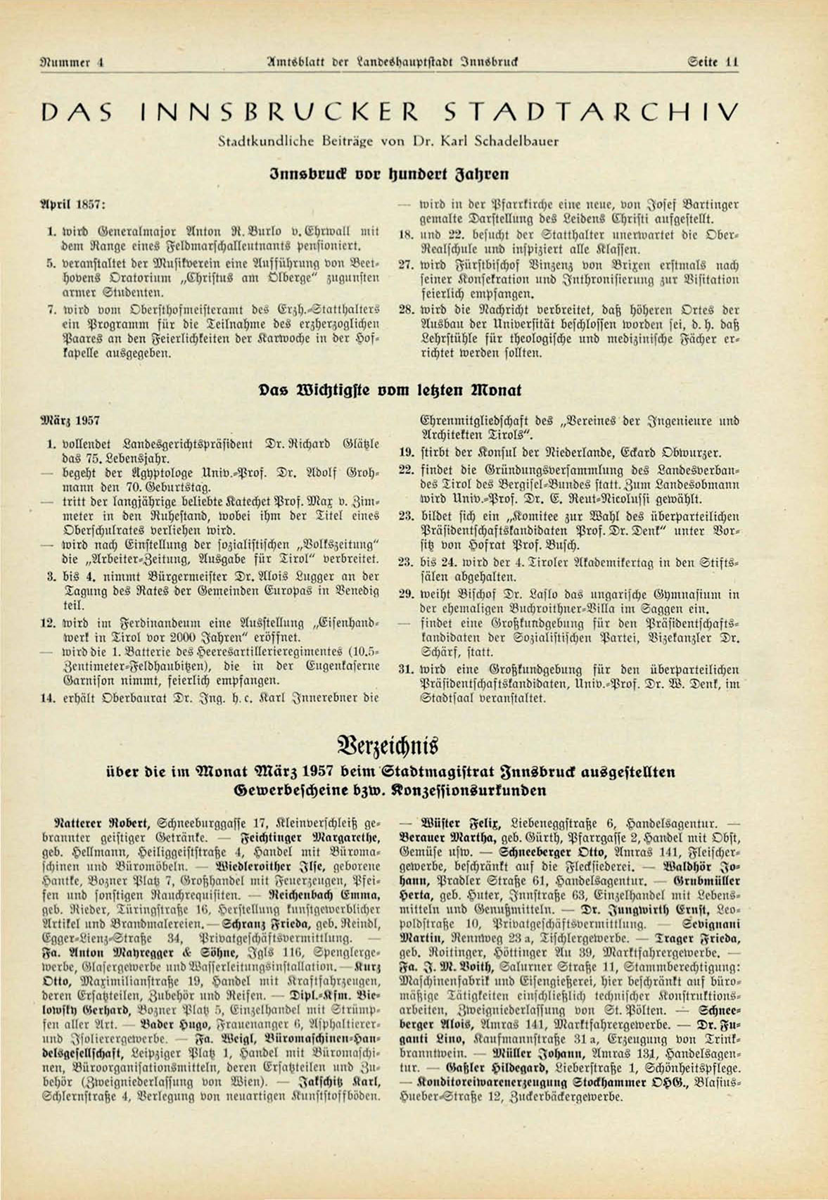 über die im Monat M ä r z 1957 beim Stadtmagistrat Innsbruck ausgestellten