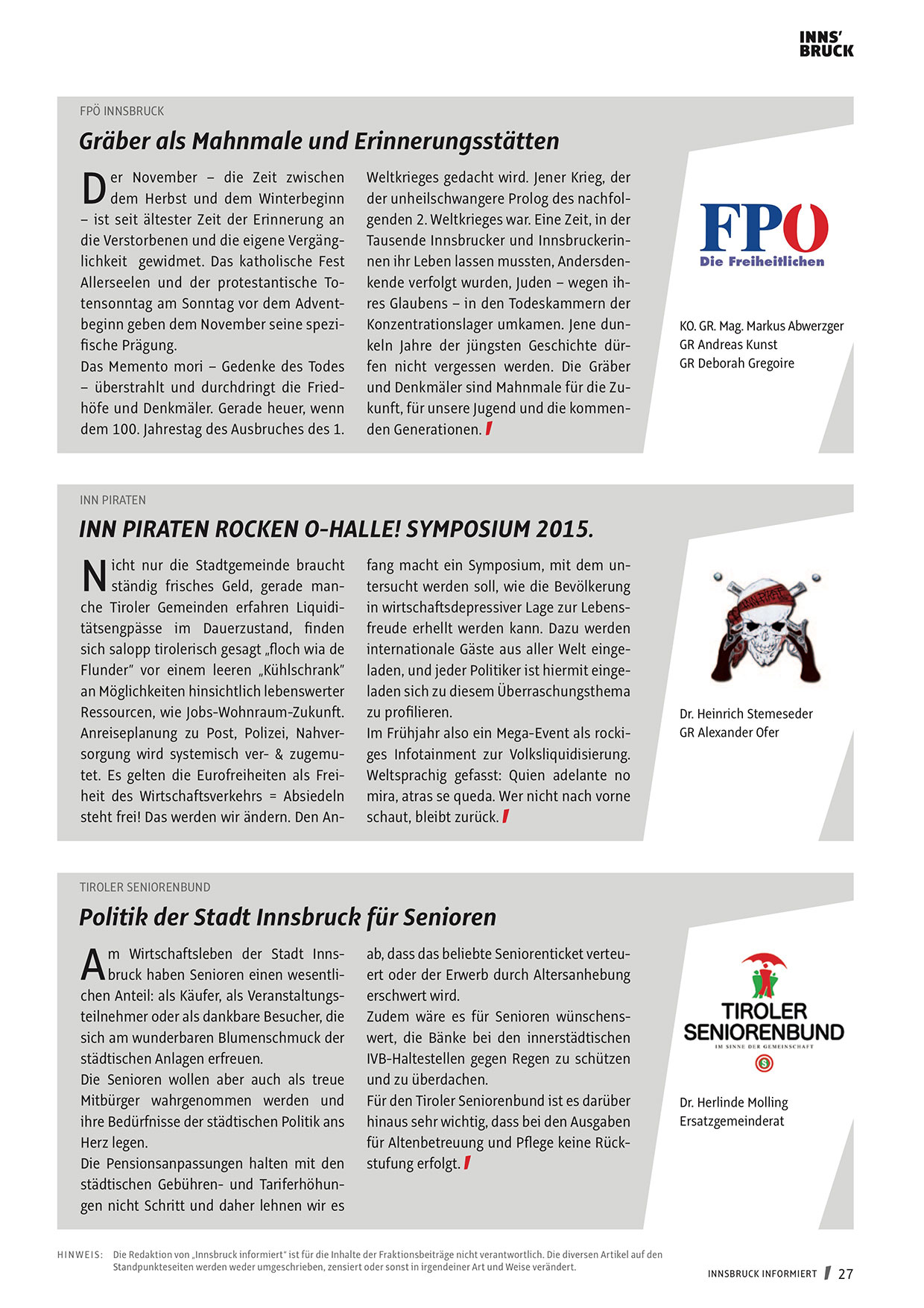 H i n W ei s : die redaktion von „innsbruck informiert“ ist für die inhalte der fraktionsbeiträge nicht verantwortlich . die diversen Artikel auf den
