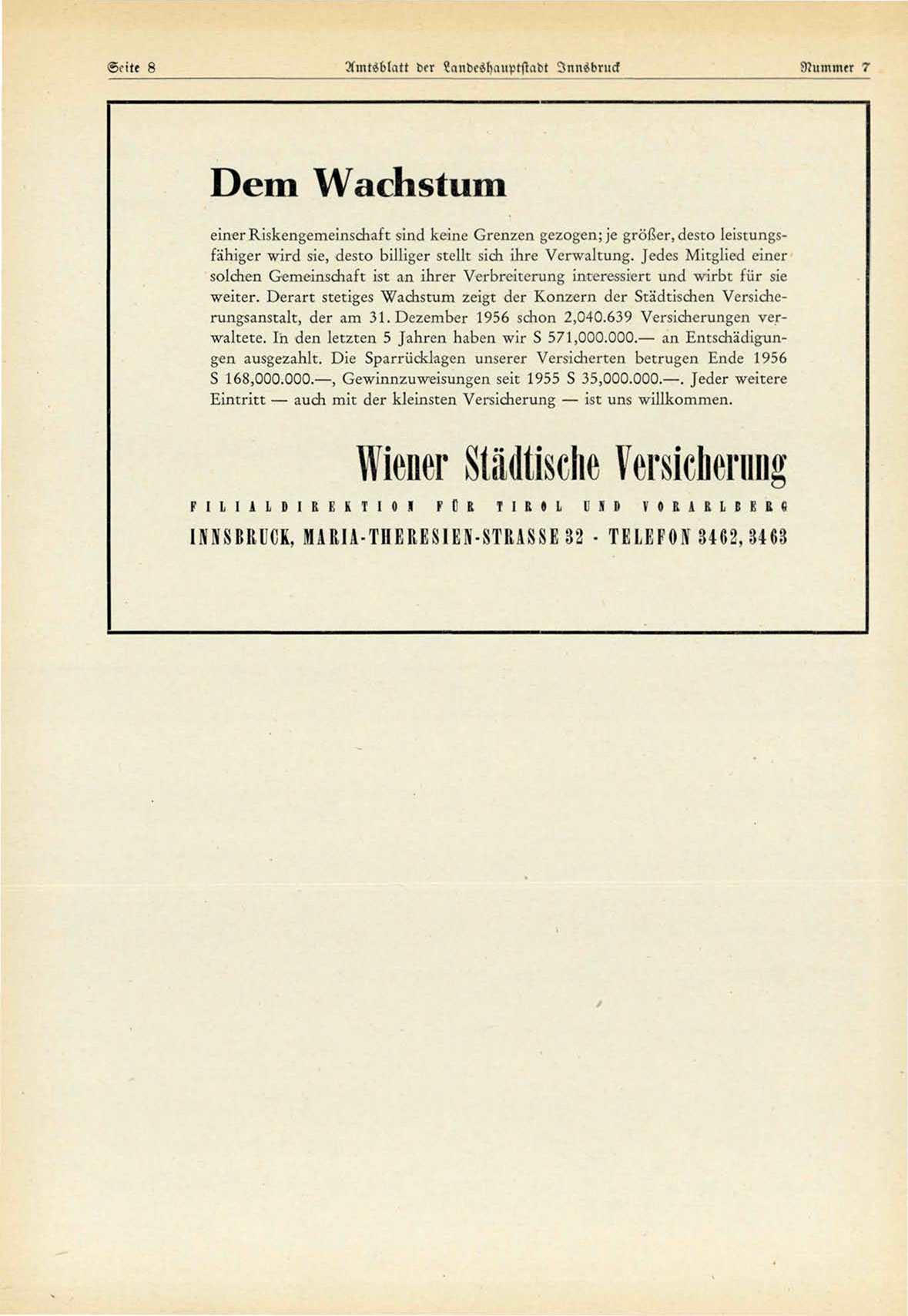 weiter. Derart:;rerize8 ^i^acn8Hurn ^eizr 6er I^on^ern 6er 3ra6rÌ8cnen Verzicnerun^8an8ra1r, de r arn 31. De^ernl)er 1956 8cnon 2,040 .639 VerzicnerunZen verv/airere. In 6en lereren 5 Janren naden v i r 3 571,000 .000 .— an ^nr,8cnä6ißungen aii8Fe^an1r. Die 3pa t-riickiaZen un8erer Ver8Ìcnerren I)erru^en ^n6e 1956