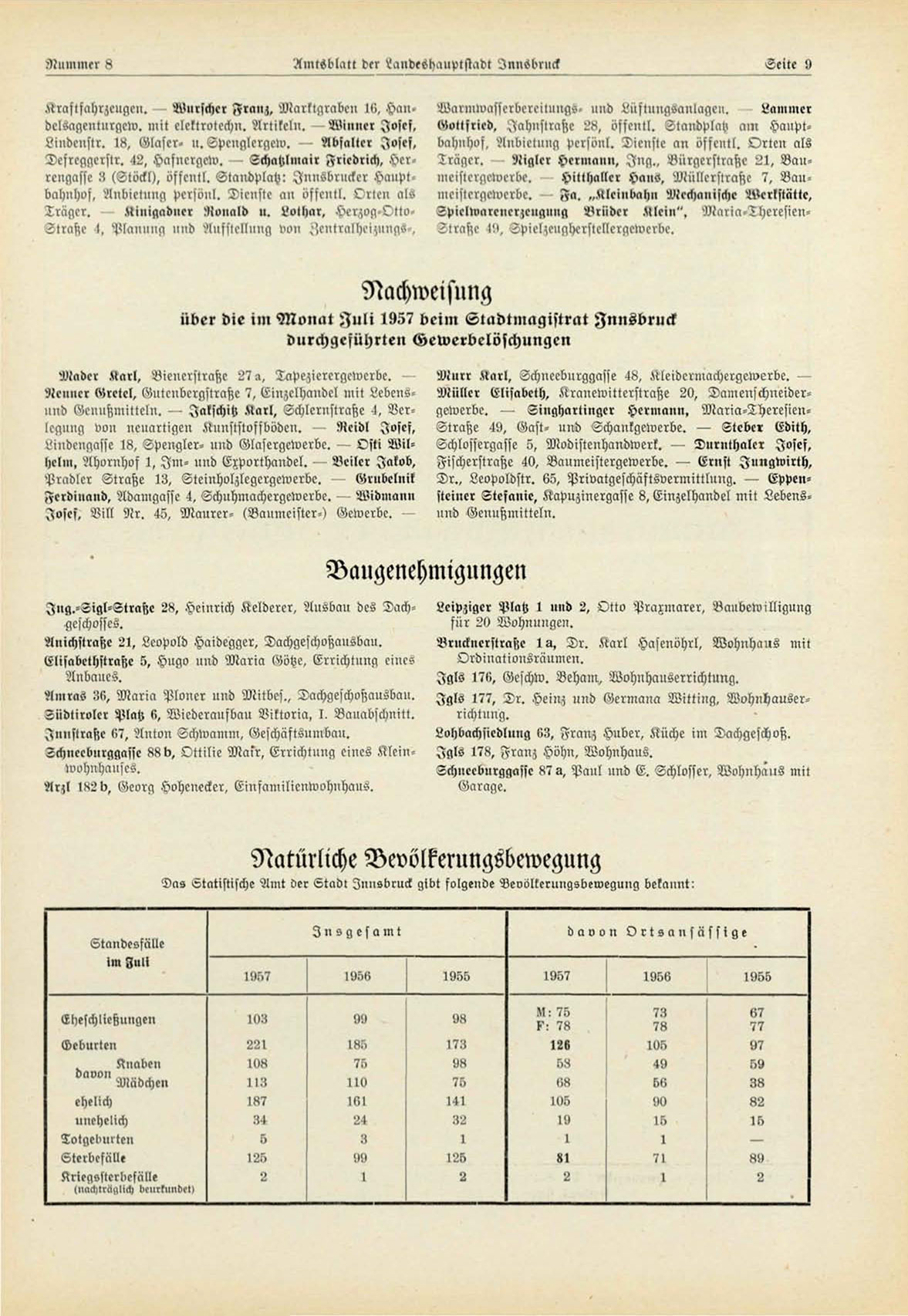 über die im Monat J u l i 1957 beim Stadtmagistrat Innsbruck