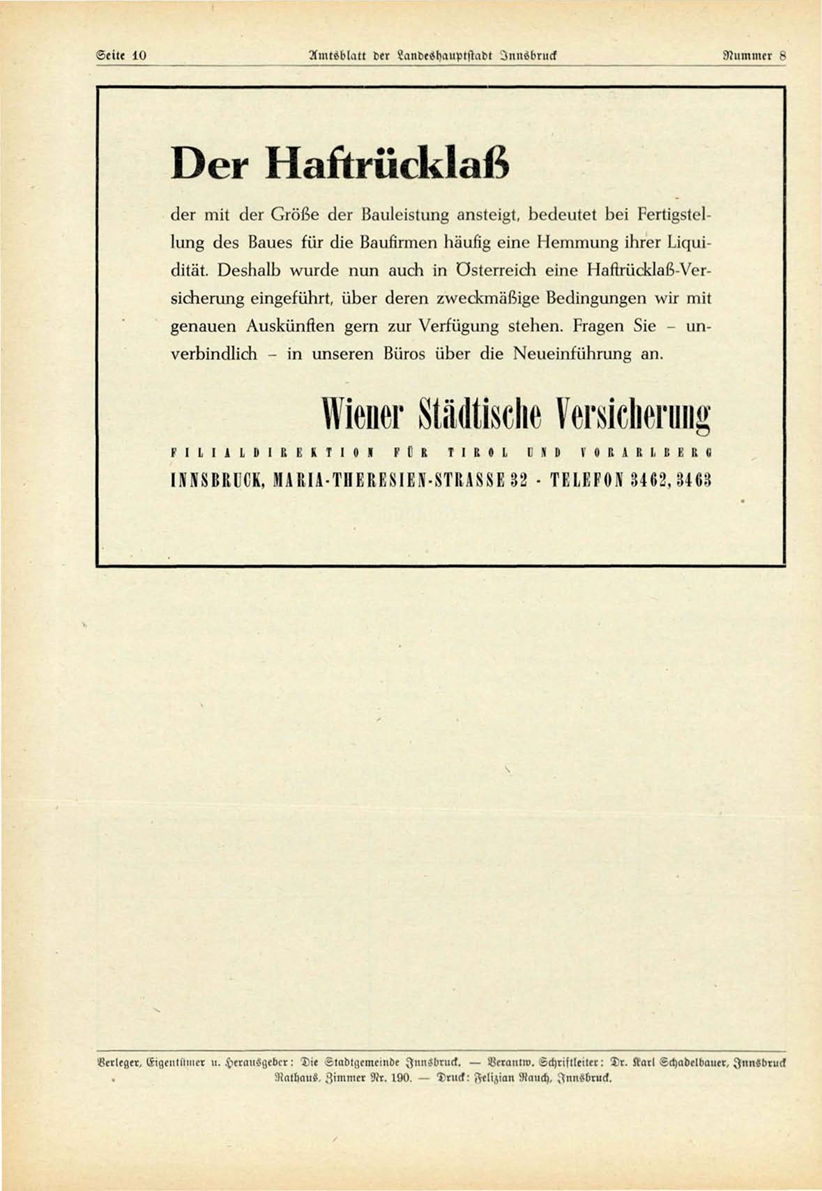 Verleger, Eigeiitiiüicr u. Heralisgebcr: Die Stadtgemeinde Innsdrucl. — Veralltw. Schriftleiter: Dr. Karl Schadelbauer, Innsbruck