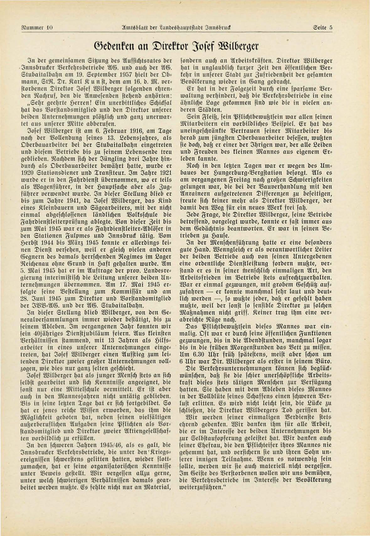Innsbrncker Verkehrsbetriebe, die unter den"Kriegsereignissen schwerstens gelitten hatten, wieder flottzumachen, hat er seilte organisatorischen Kenntnisse