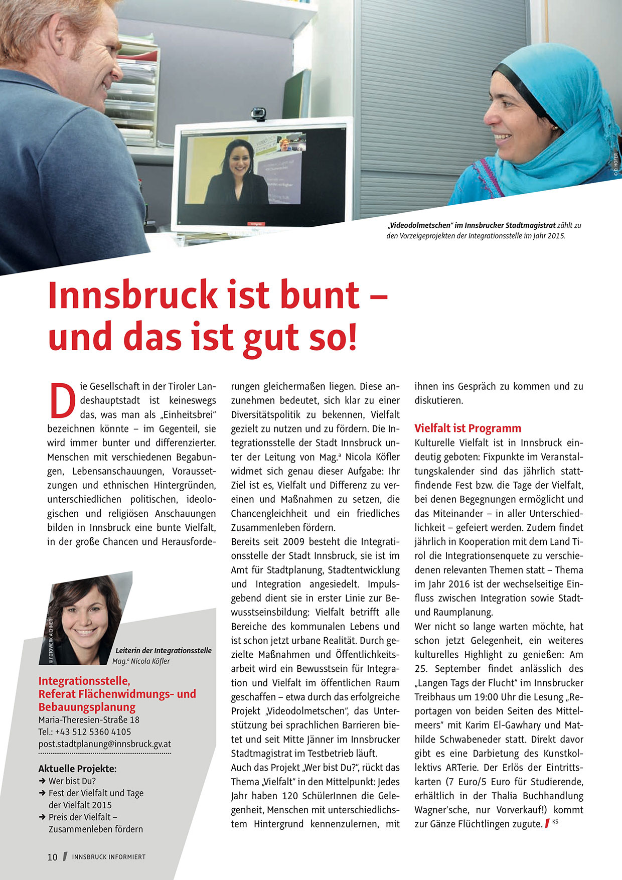 gezielt zu nutzen und zu fördern. Die Integrationsstelle der Stadt Innsbruck unter der Leitung von Mag.a Nicola Köfler