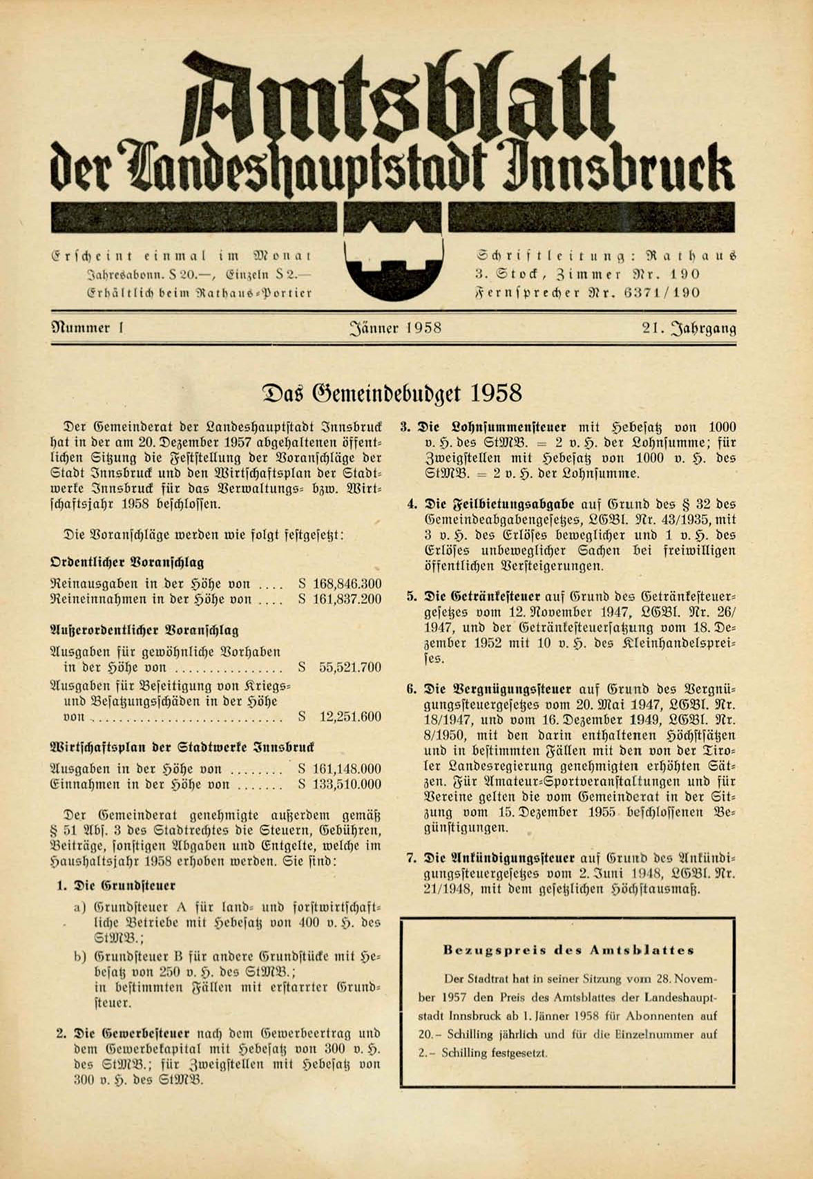 Stadt Innsbruck und den Wirtschaftsplan der Stadtwerke Innsbruck für das Verwaltungs- bzw. Wirtschaftsjahr 1958 beschlossen.