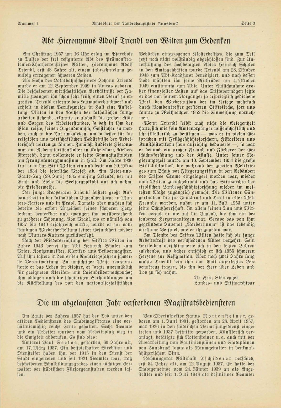 trat er in das Stift Wilten ein und legte am 20. Oktober 1934 die feierliche Profeß ab. Am Petcr-undPauls-Tag (29. Juni) 1935 empfing Triendl, der mit