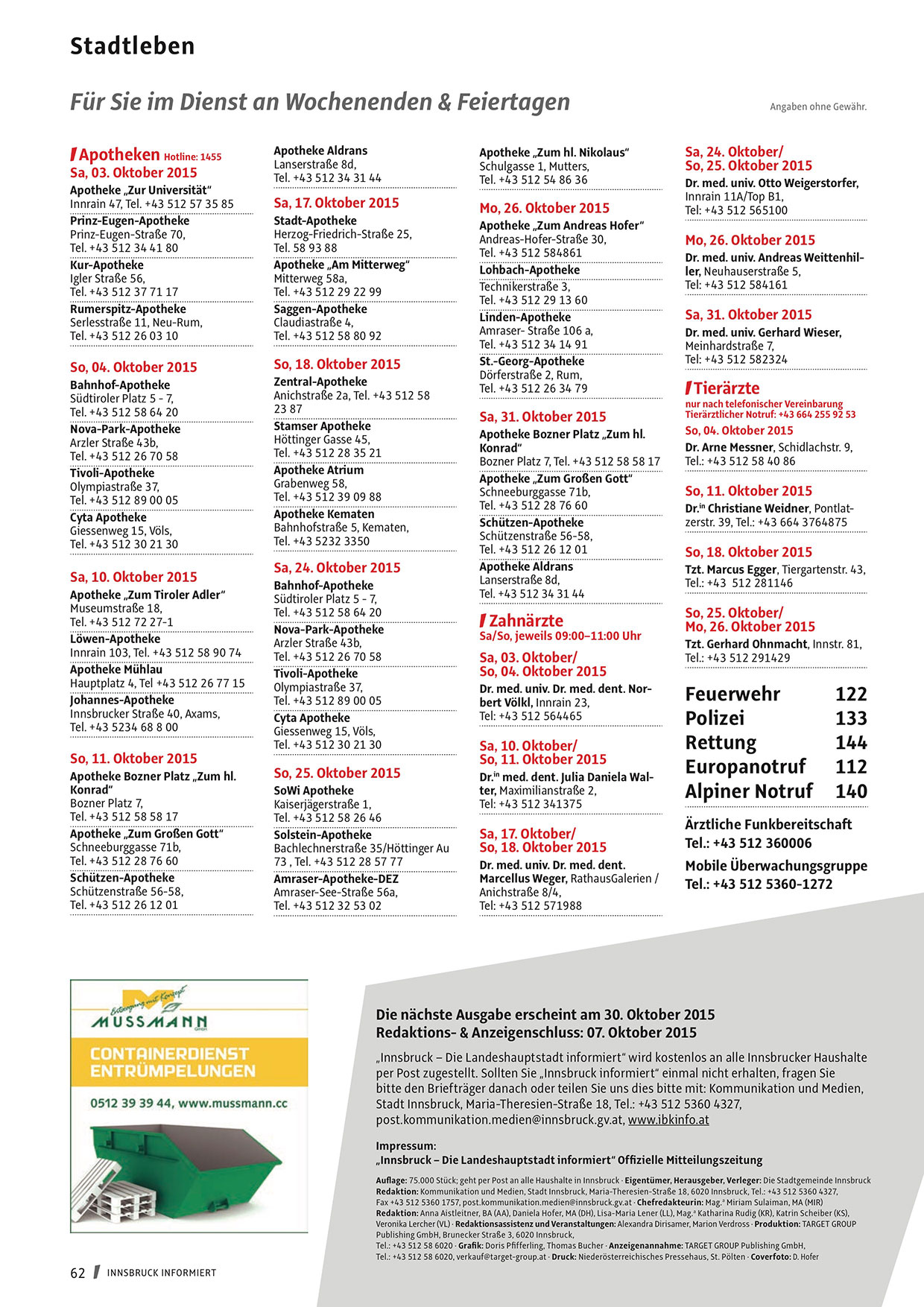 Auflage: 75.000 Stück; geht per Post an alle Haushalte in Innsbruck · Eigentümer, Herausgeber, Verleger: Die Stadtgemeinde Innsbruck