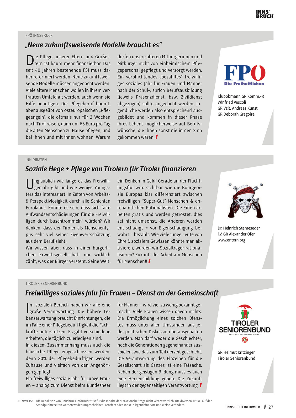 H I N W EI S : Die Redaktion von „Innsbruck informiert“ ist für die Inhalte der Fraktionsbeiträge nicht verantwortlich . Die diversen Artikel auf den