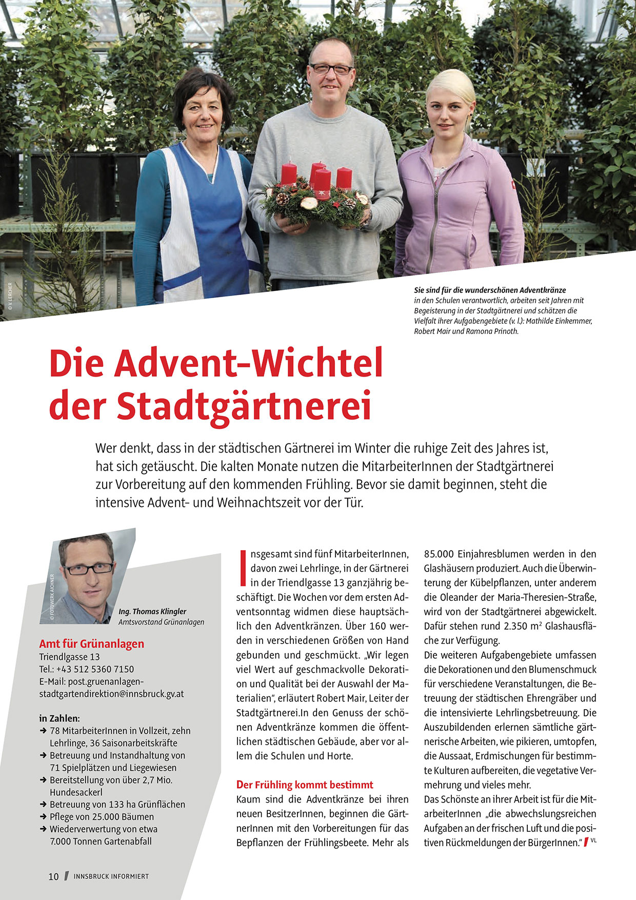 Stadtgärtnerei .In den Genuss der schönen Adventkränze kommen die öffentlichen städtischen Gebäude, aber vor allem die Schulen und Horte .