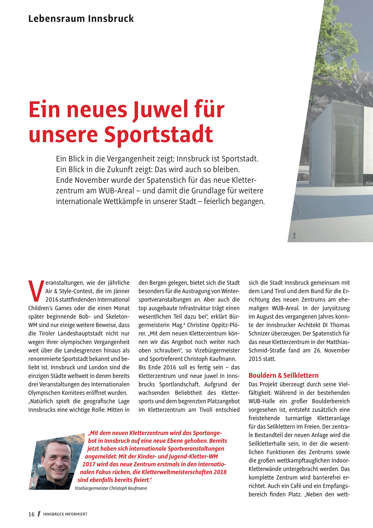 „Mit dem neuen Kletterzentrum wird das Sportangebot in Innsbruck auf eine neue Ebene gehoben. Bereits