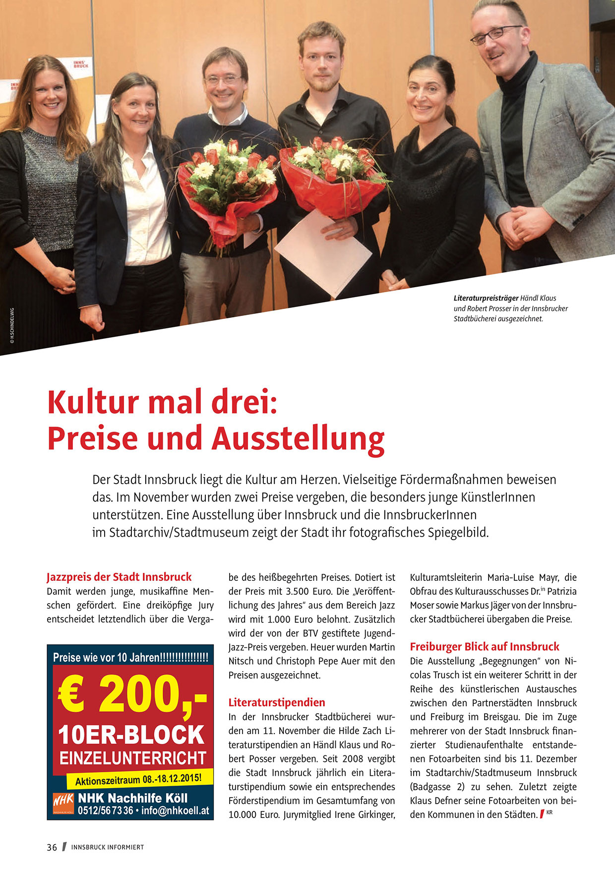 die Stadt Innsbruck jährlich ein Literaturstipendium sowie ein entsprechendes