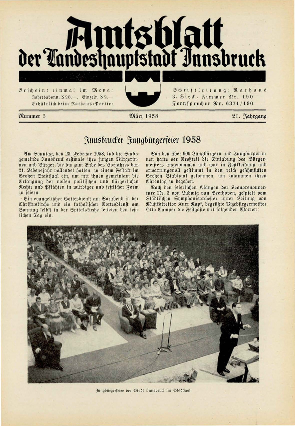 Am Sonntag, den 2Z. Februar 1958, lud die Stadtgemeinde Innsbruck erstmals ihre jungen Bürgerinnen nnd Bürger, die bis zum Ende des Vorjahres das