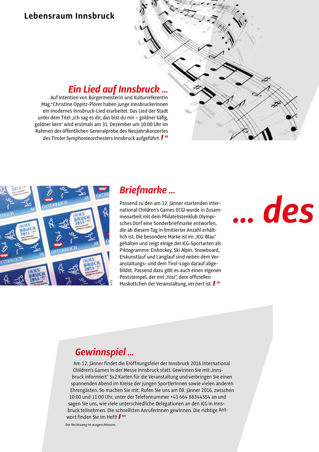sagen Sie uns, wie viele unterschiedliche Delegationen an den ICG in Innsbruck teilnehmen . Die schnellsten AnruferInnen gewinnen . Die richtige Antwort finden Sie im Heft! DH