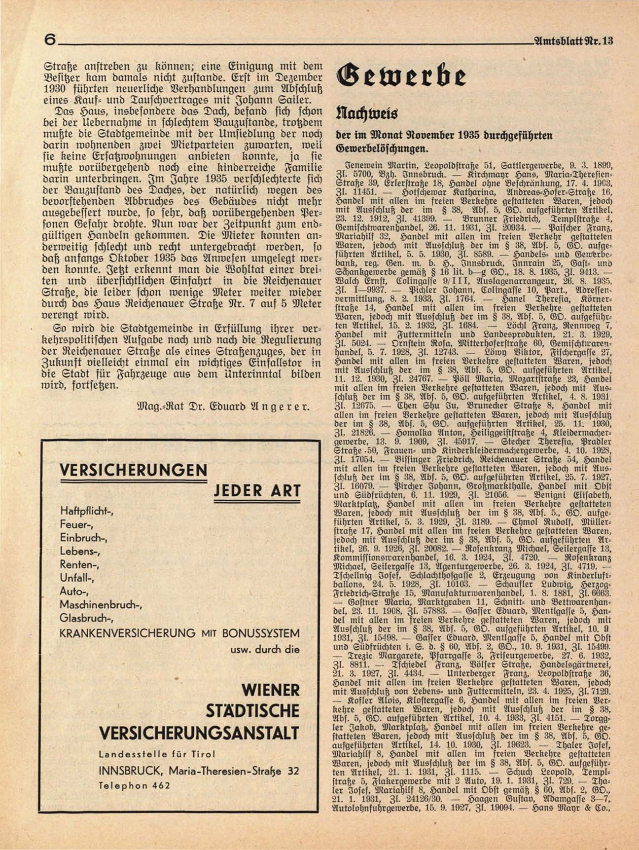 Zl. 1—9937. — Pichler Johann. Colingasse 10, Part.. AdressenVermittlung. 8. 2. 1933, Zl. 1764. — Hanel Theresia, Körnerstraße 14, Handel mit allen im freien Verkehre gestatteten