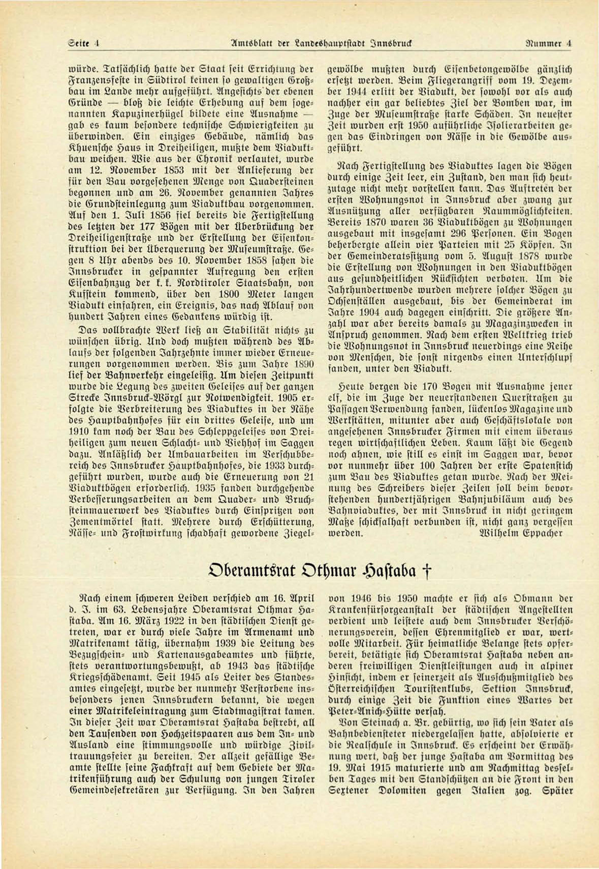 d. I . im 63. Lebensjahre Oberamtsrat Othmar Hastaba. Am 16. März 1922 in den städtischen Dienst getreten, war er durch viele Jahre im Armenamt und