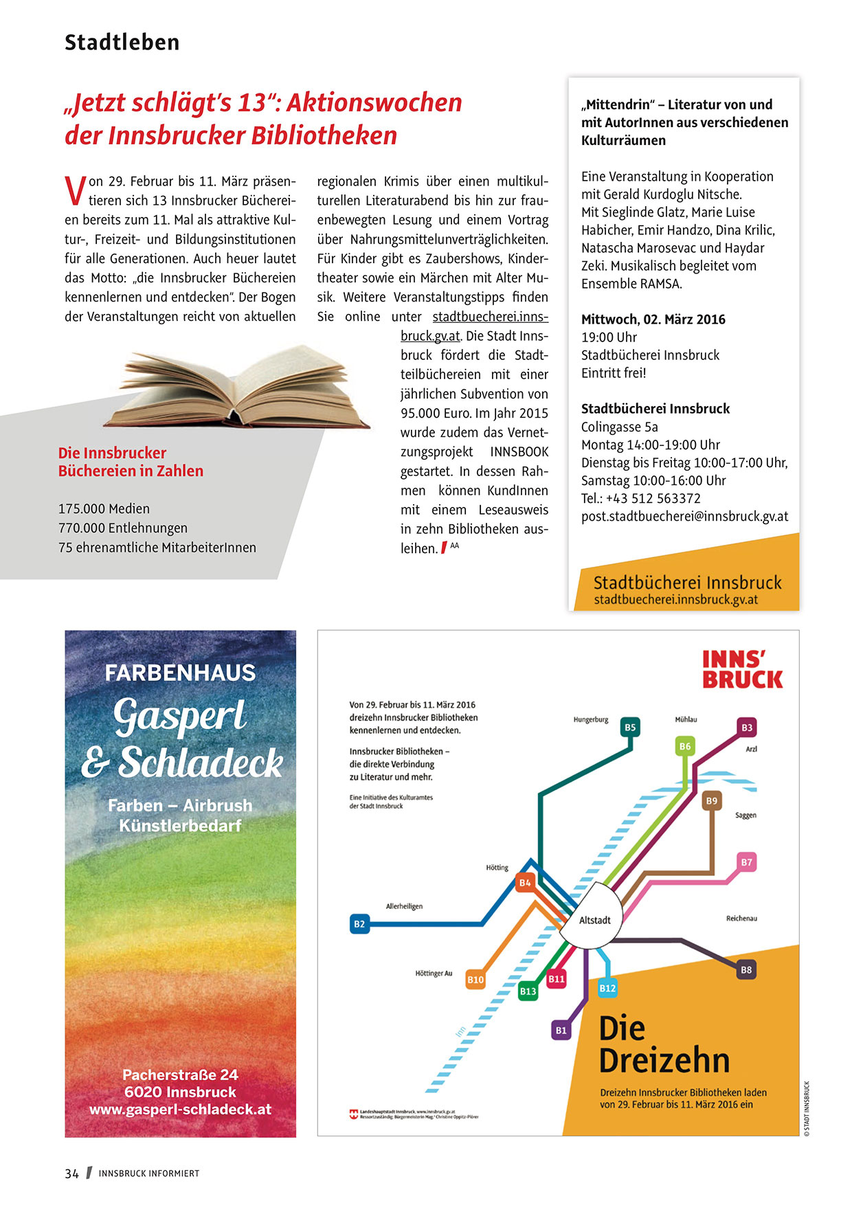on 29. Februar bis 11. März präsentieren sich 13 Innsbrucker Büchereien bereits zum 11. Mal als attraktive Kultur-, Freizeit- und Bildungsinstitutionen