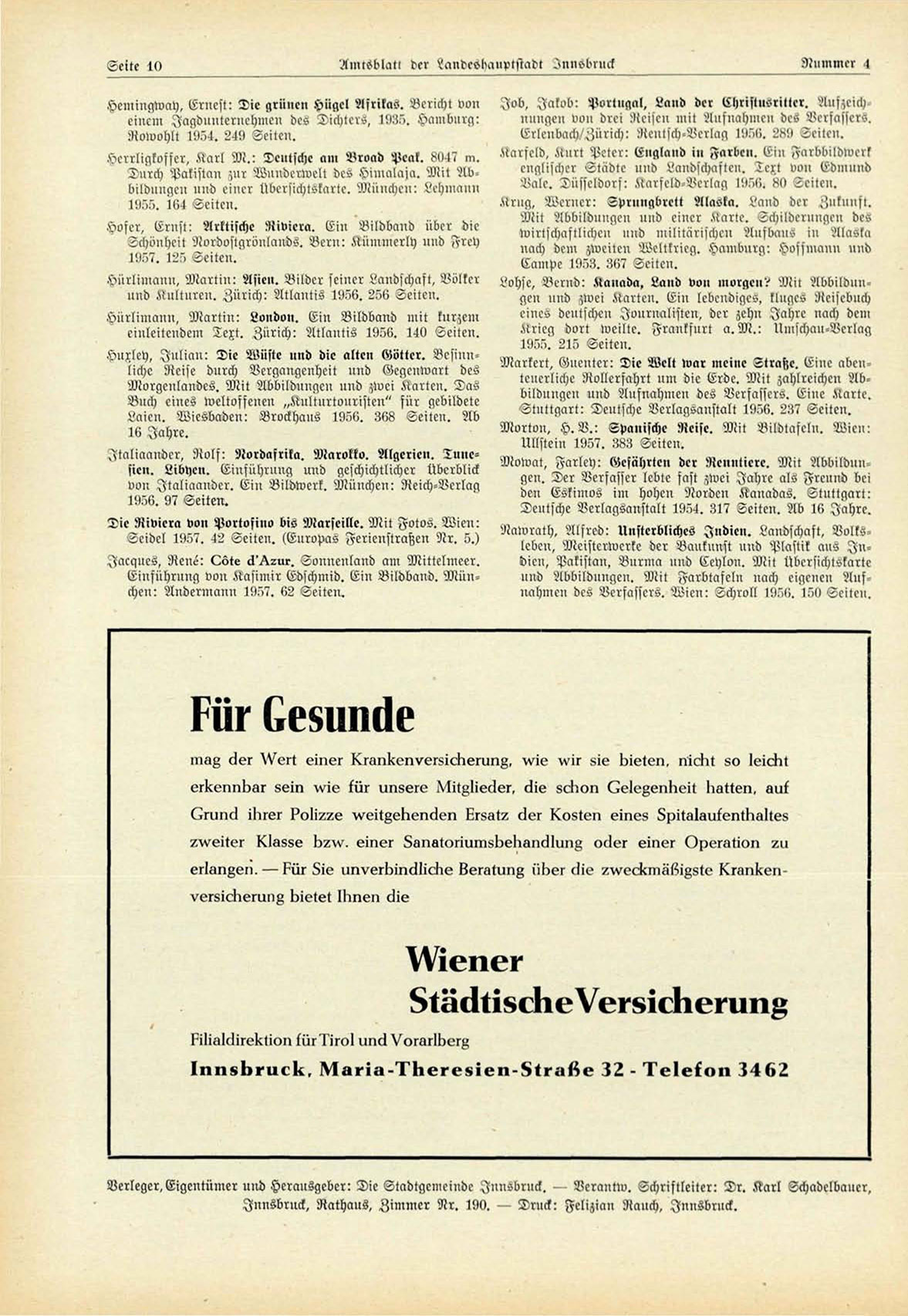 Verleger,Eigentümer uud Herausgeber: Die Stadtgemeiude Innsbruck. - Veranlü.". Schriftleiter: D>" Karl