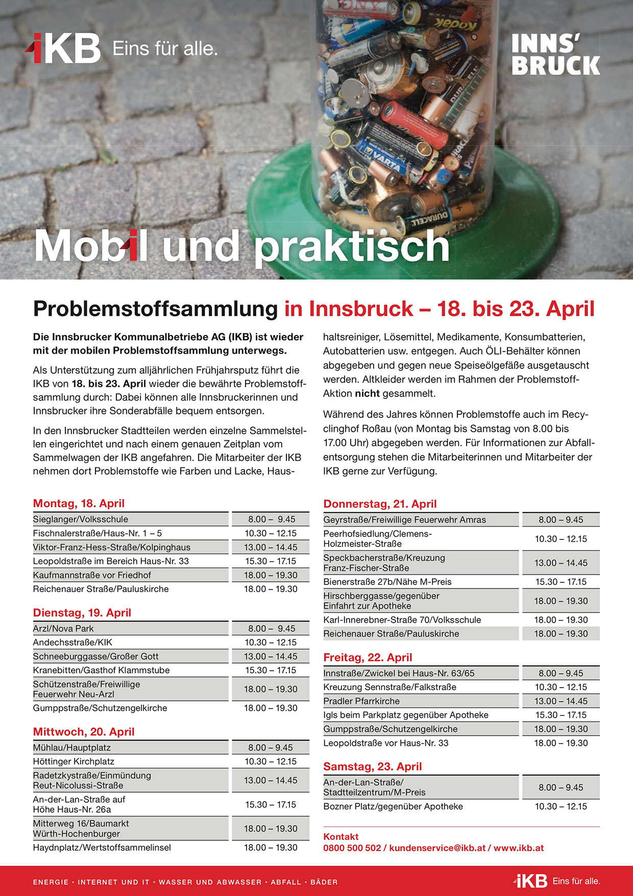 IKB von 18. bis 23. April wieder die bewährte Problemstoffsammlung durch: Dabei können alle Innsbruckerinnen und