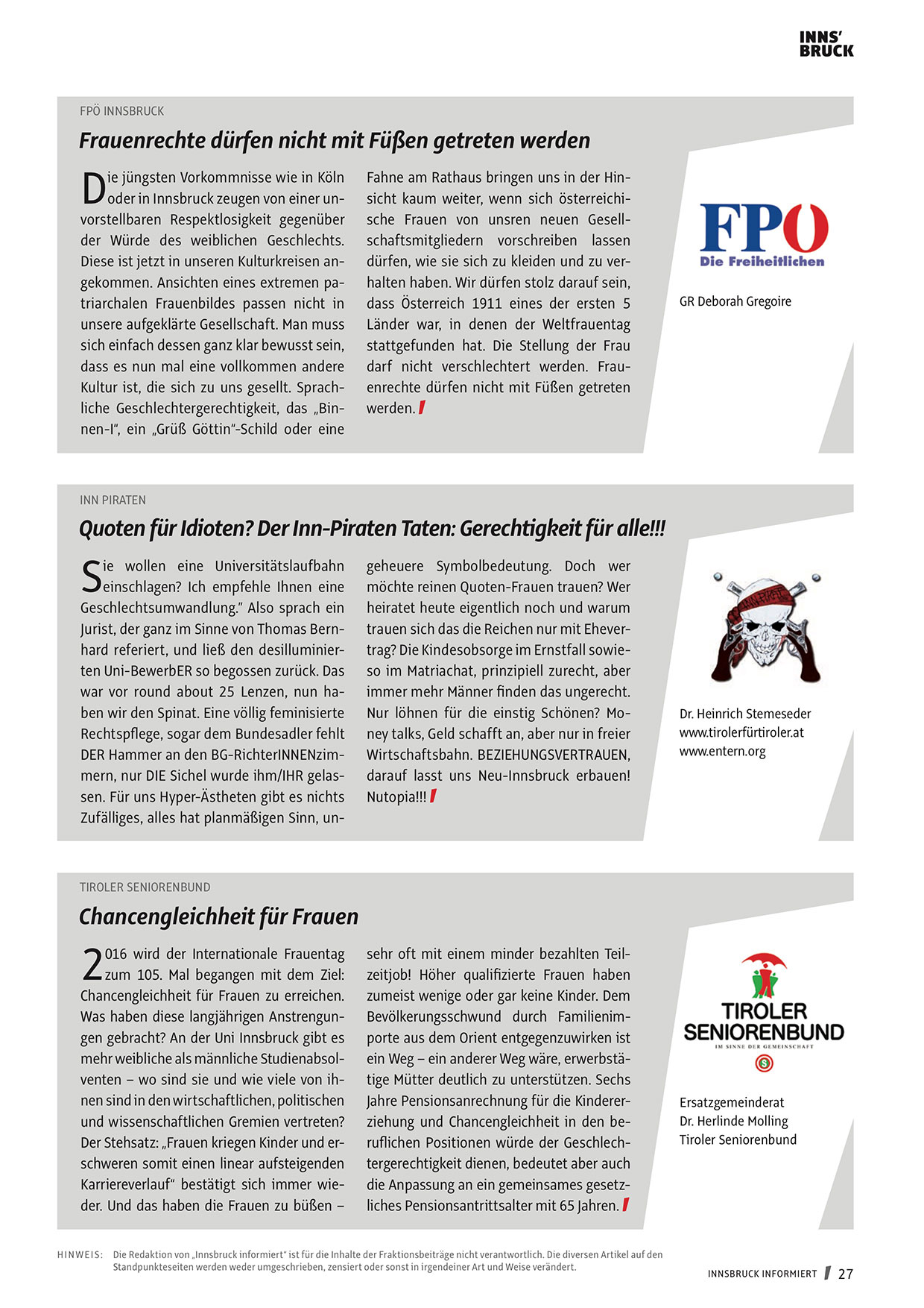 H I N W EI S : Die Redaktion von „Innsbruck informiert“ ist für die Inhalte der Fraktionsbeiträge nicht verantwortlich . Die diversen Artikel auf den