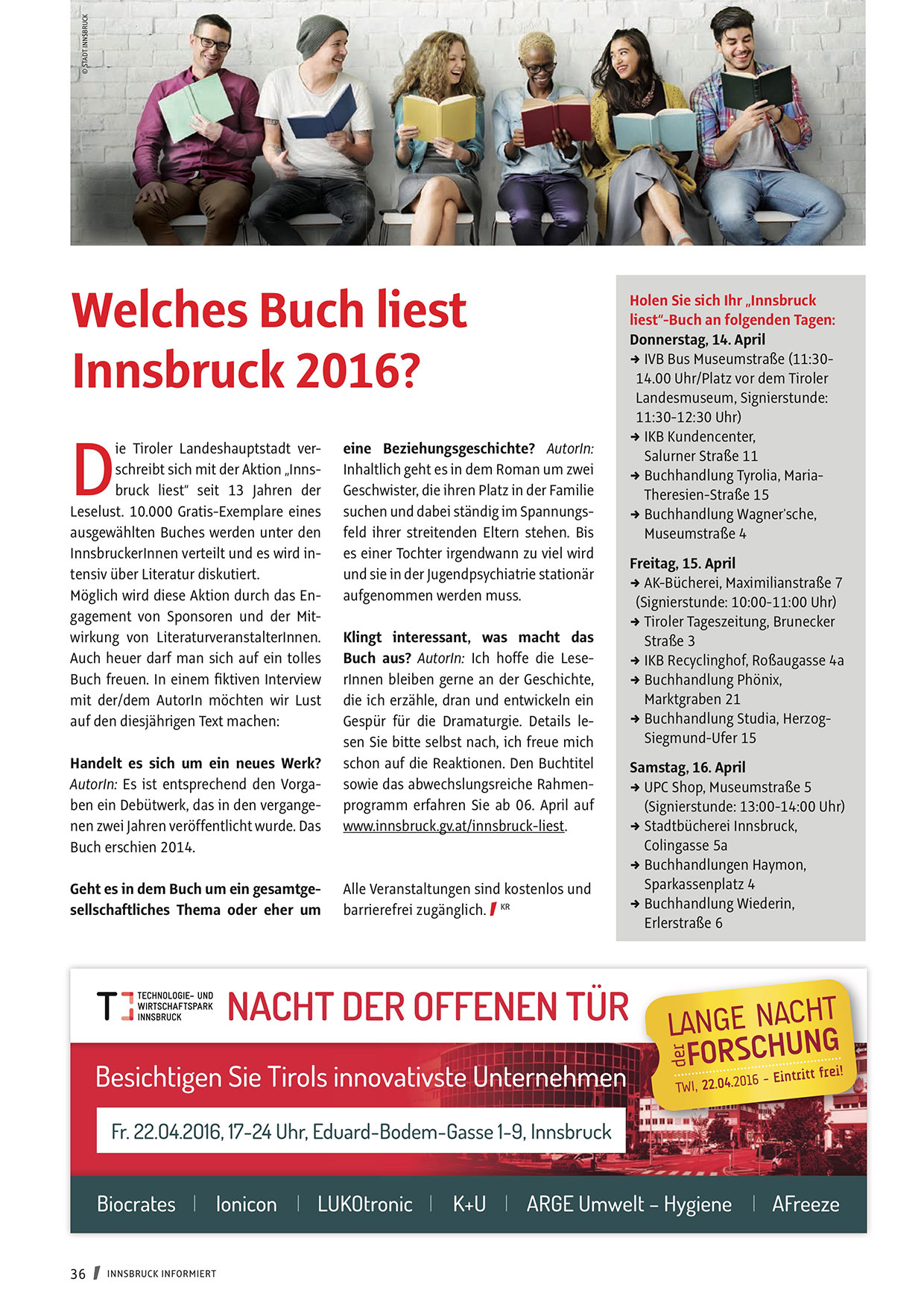 ie Tiroler Landeshauptstadt verschreibt sich mit der Aktion „Innsbruck liest“ seit 13 Jahren der