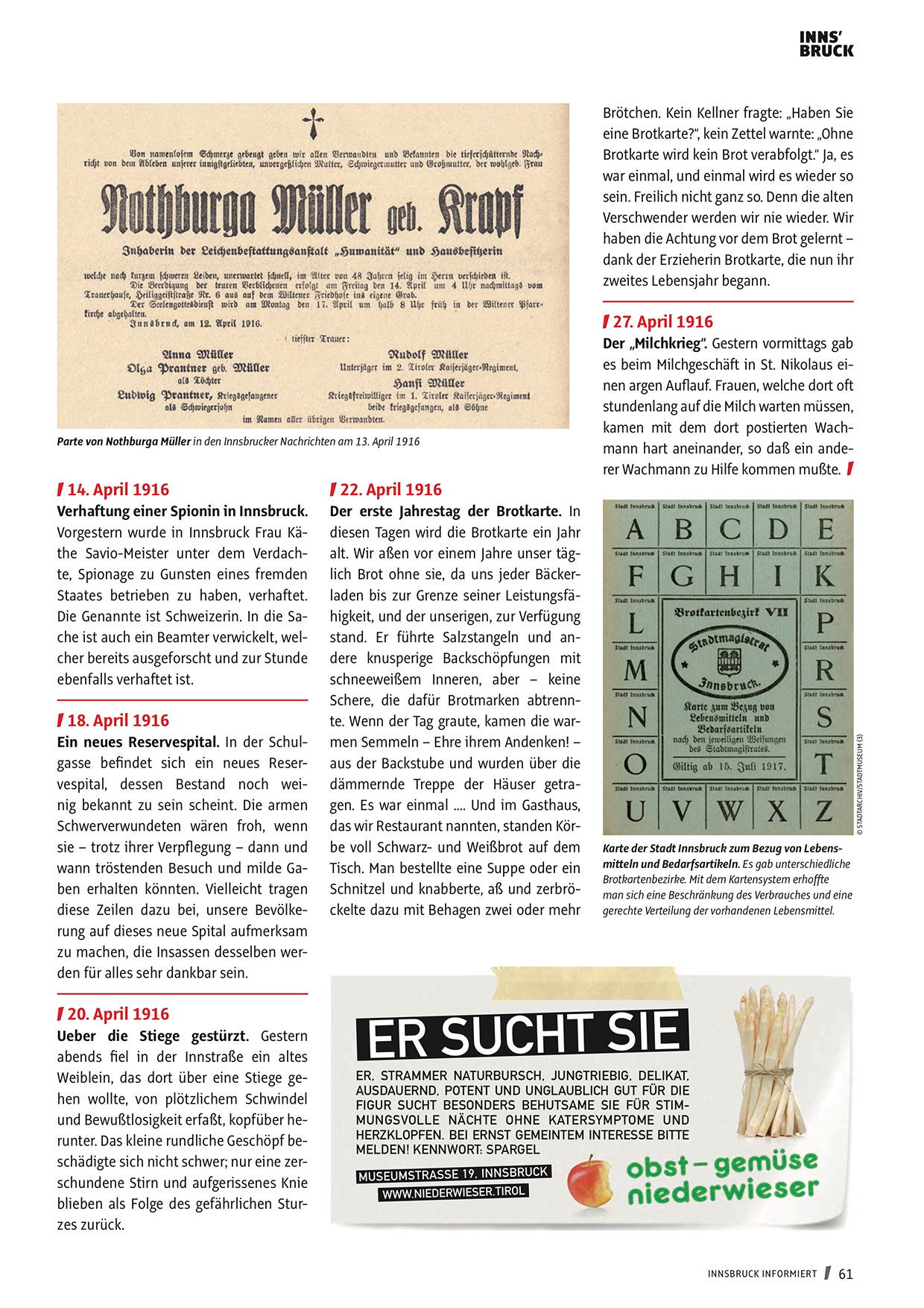 Parte von Nothburga Müller in den Innsbrucker Nachrichten am 13. April 1916