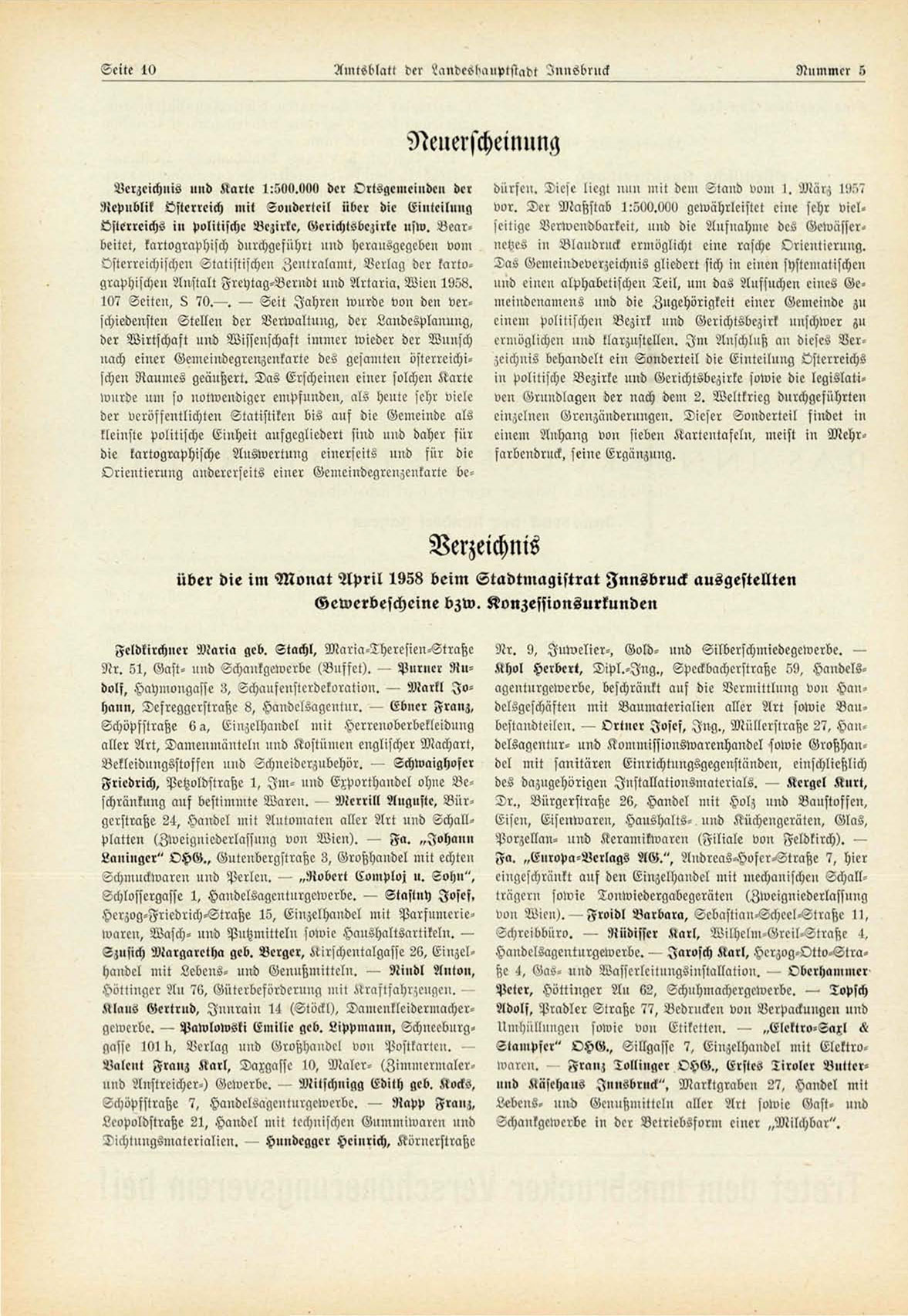 über die im Monat A p r i l 1958 beim Stadtmagistrat Innsbruck ausgestellten