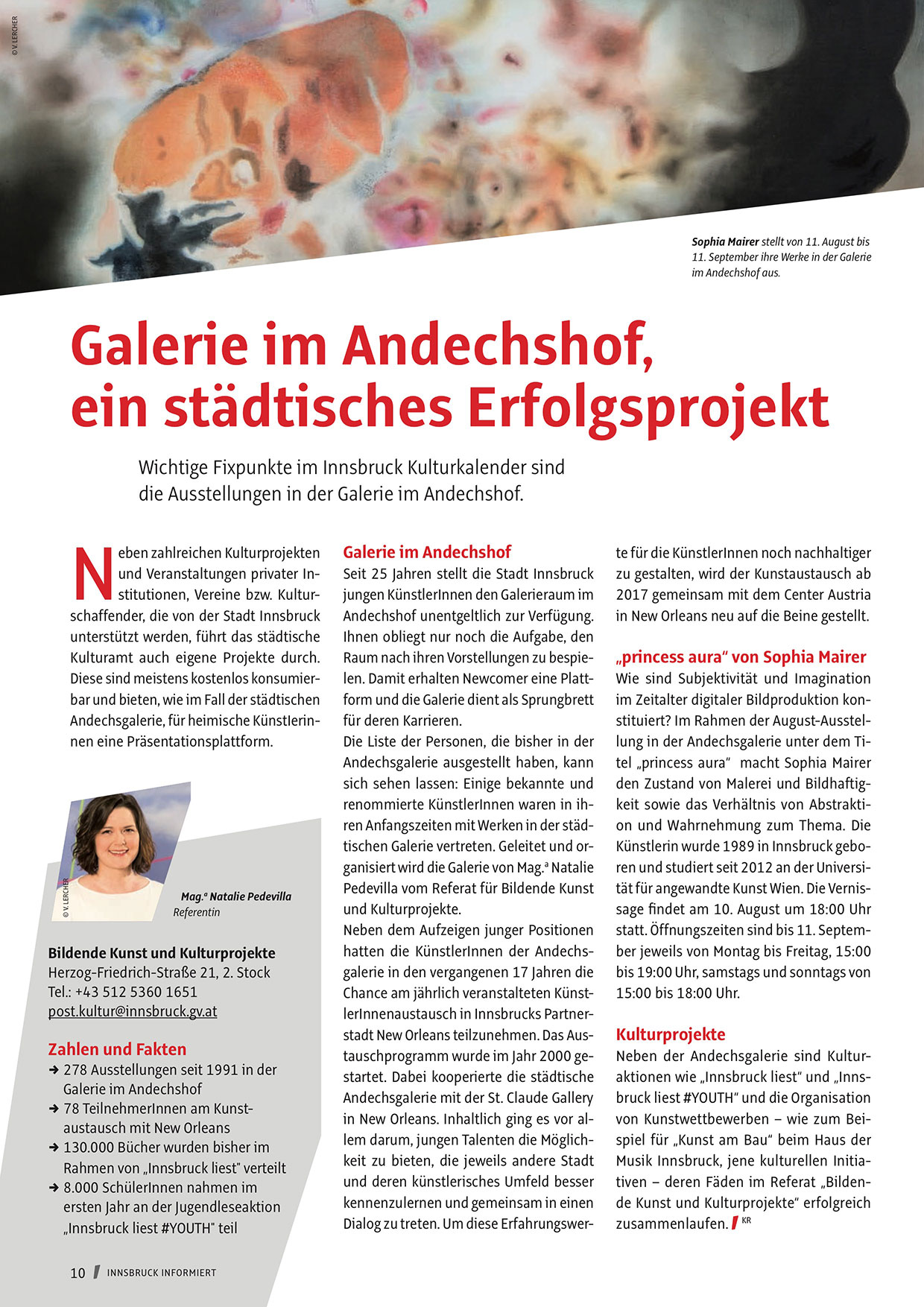 Neben der Andechsgalerie sind Kulturaktionen wie „Innsbruck liest“ und „Innsbruck liest #YOUTH“ und die Organisation