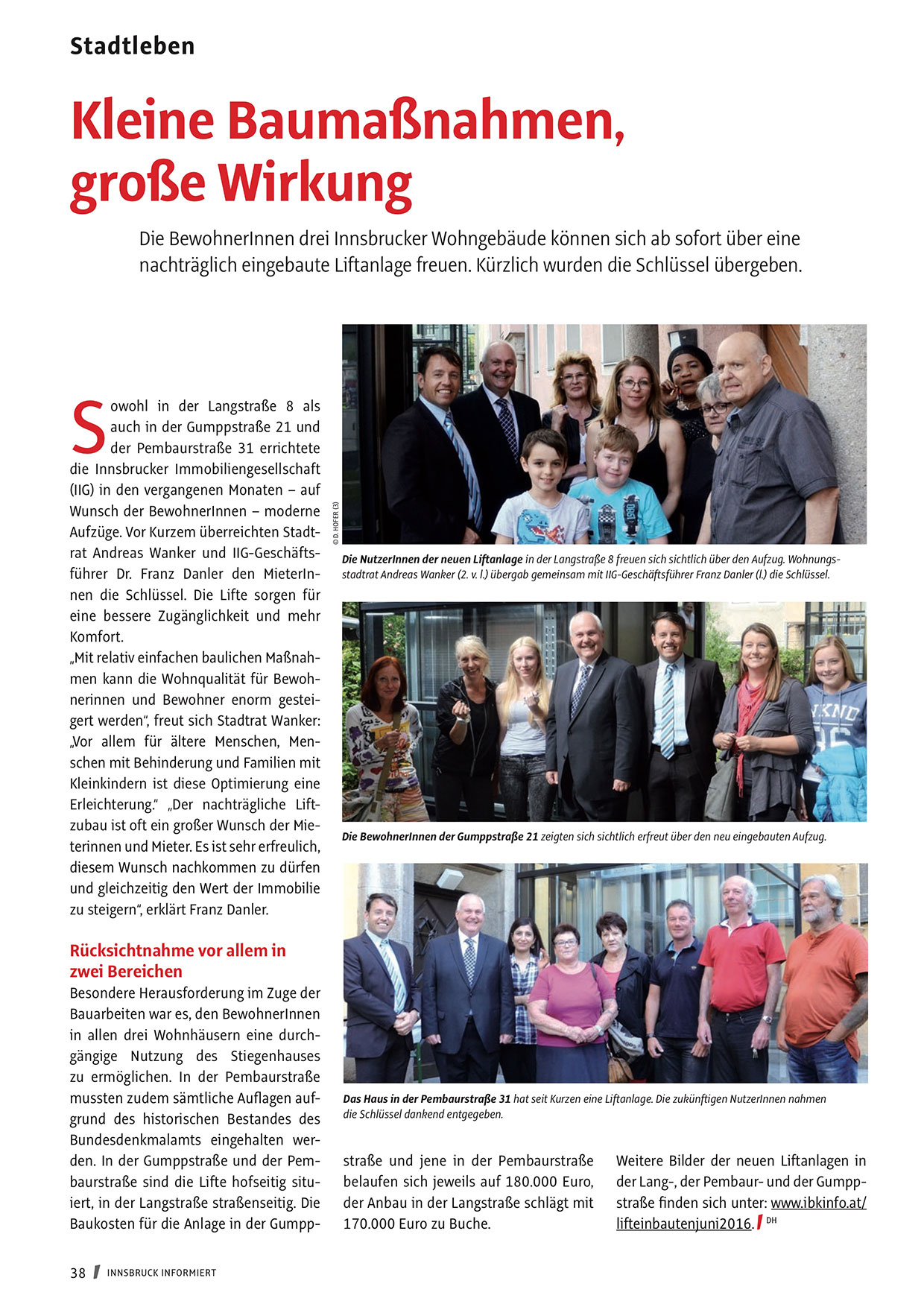 Aufzüge. Vor Kurzem überreichten Stadtrat Andreas Wanker und IIG-Geschäftsführer Dr. Franz Danler den MieterInnen die Schlüssel. Die Lifte sorgen für