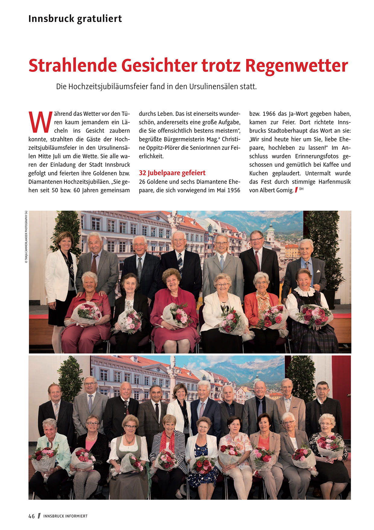 konnte, strahlten die Gäste der Hochzeitsjubiläumsfeier in den Ursulinensälen Mitte Juli um die Wette. Sie alle waren der Einladung der Stadt Innsbruck