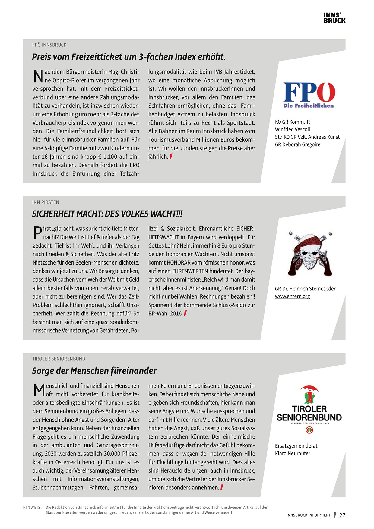 H I N W EI S : Die Redaktion von „Innsbruck informiert“ ist für die Inhalte der Fraktionsbeiträge nicht verantwortlich . Die diversen Artikel auf den