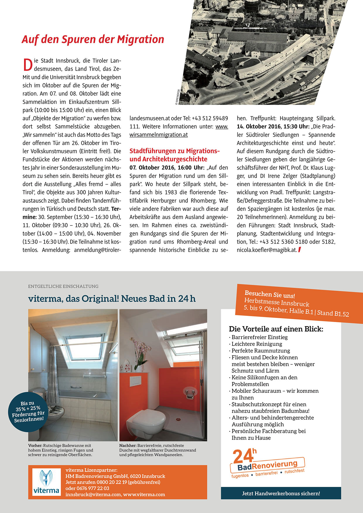 20 TeilnehmerInnen). Anmeldung zu beiden Führungen: Stadt Innsbruck, Stadtplanung, Stadtentwicklung und Integration, Tel.: +43 512 5360 5180 oder 5182,