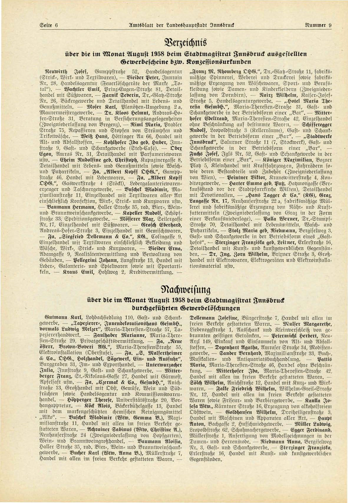 über die im Monat August 1958 beim Stadtmagistrat Innsbruck ausgestellten