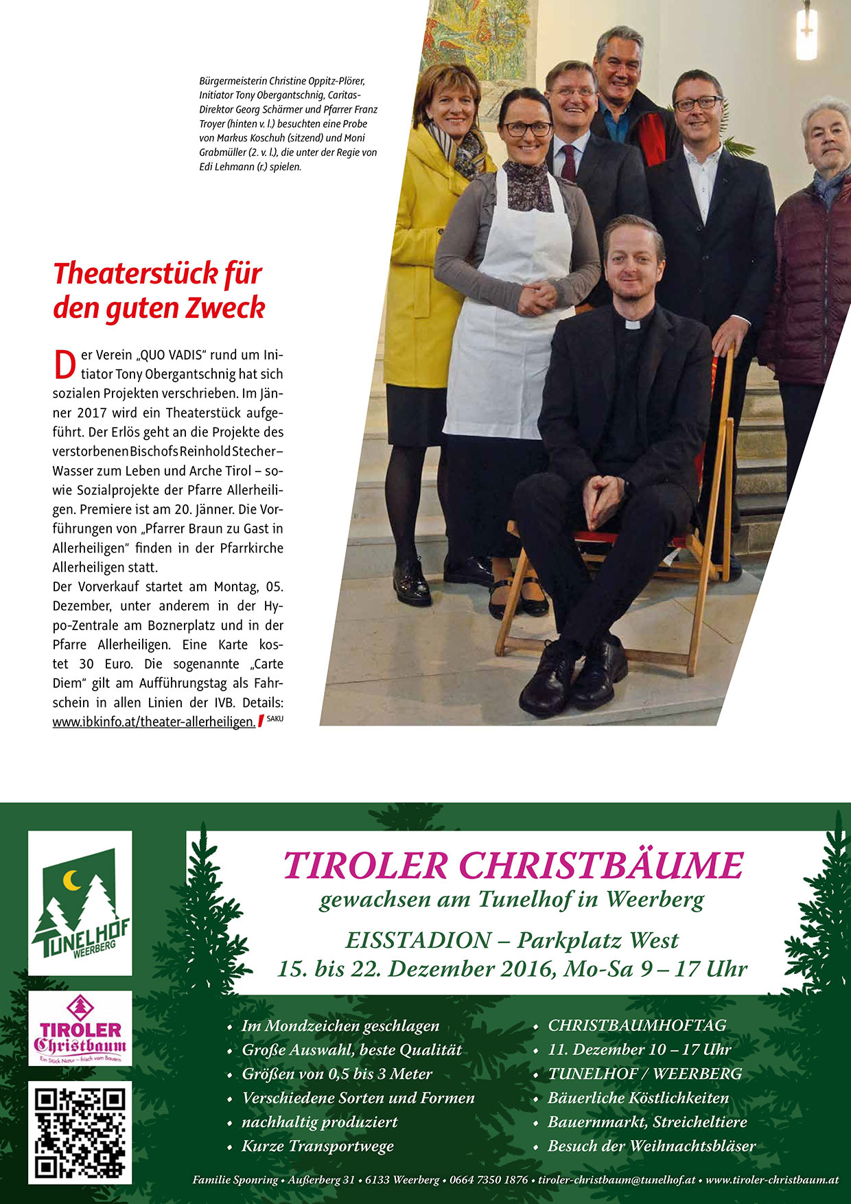Wasser zum Leben und Arche Tirol – sowie Sozialprojekte der Pfarre Allerheiligen. Premiere ist am 20. Jänner. Die Vorführungen von „Pfarrer Braun zu Gast in