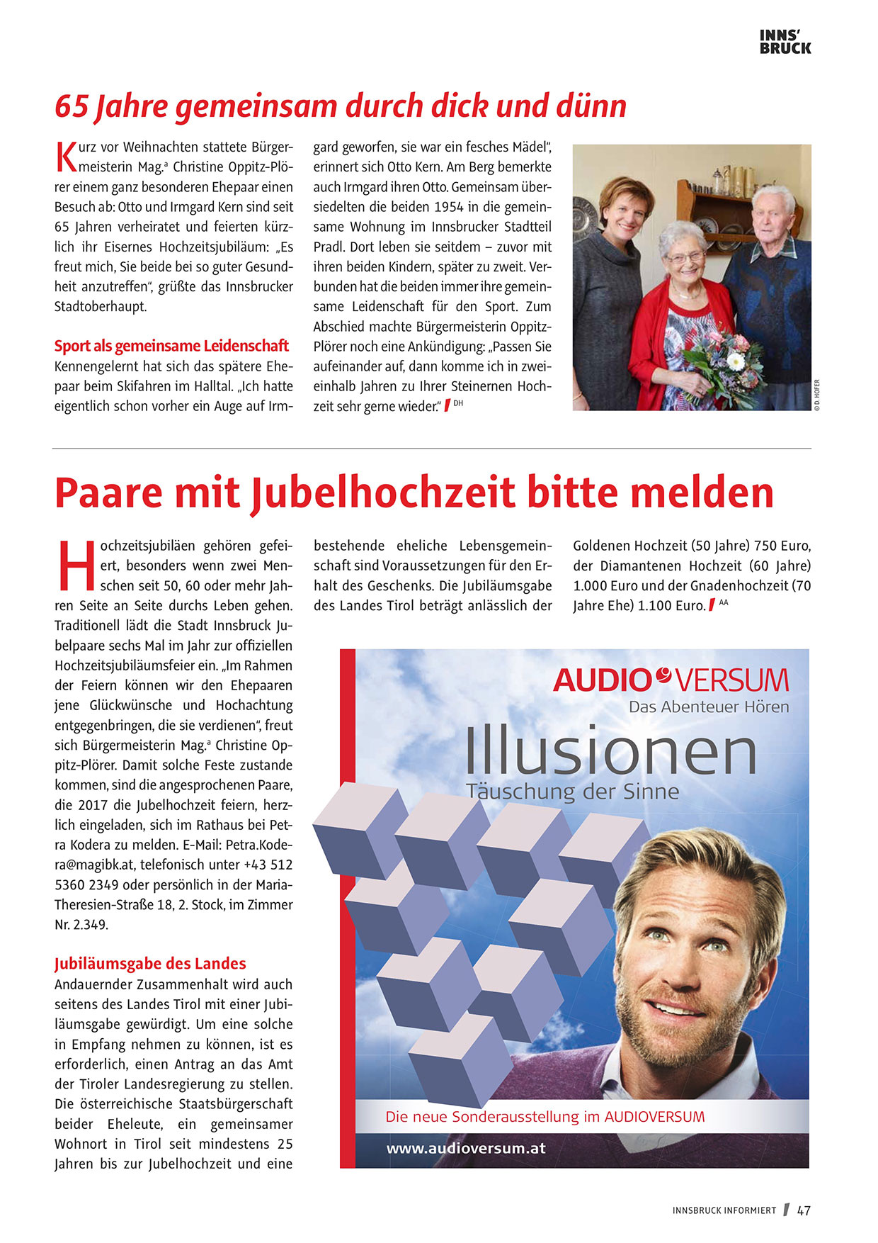 die 2017 die Jubelhochzeit feiern, herzlich eingeladen, sich im Rathaus bei Petra Kodera zu melden. E-Mail: Petra.Kodera@magibk.at, telefonisch unter +43 512