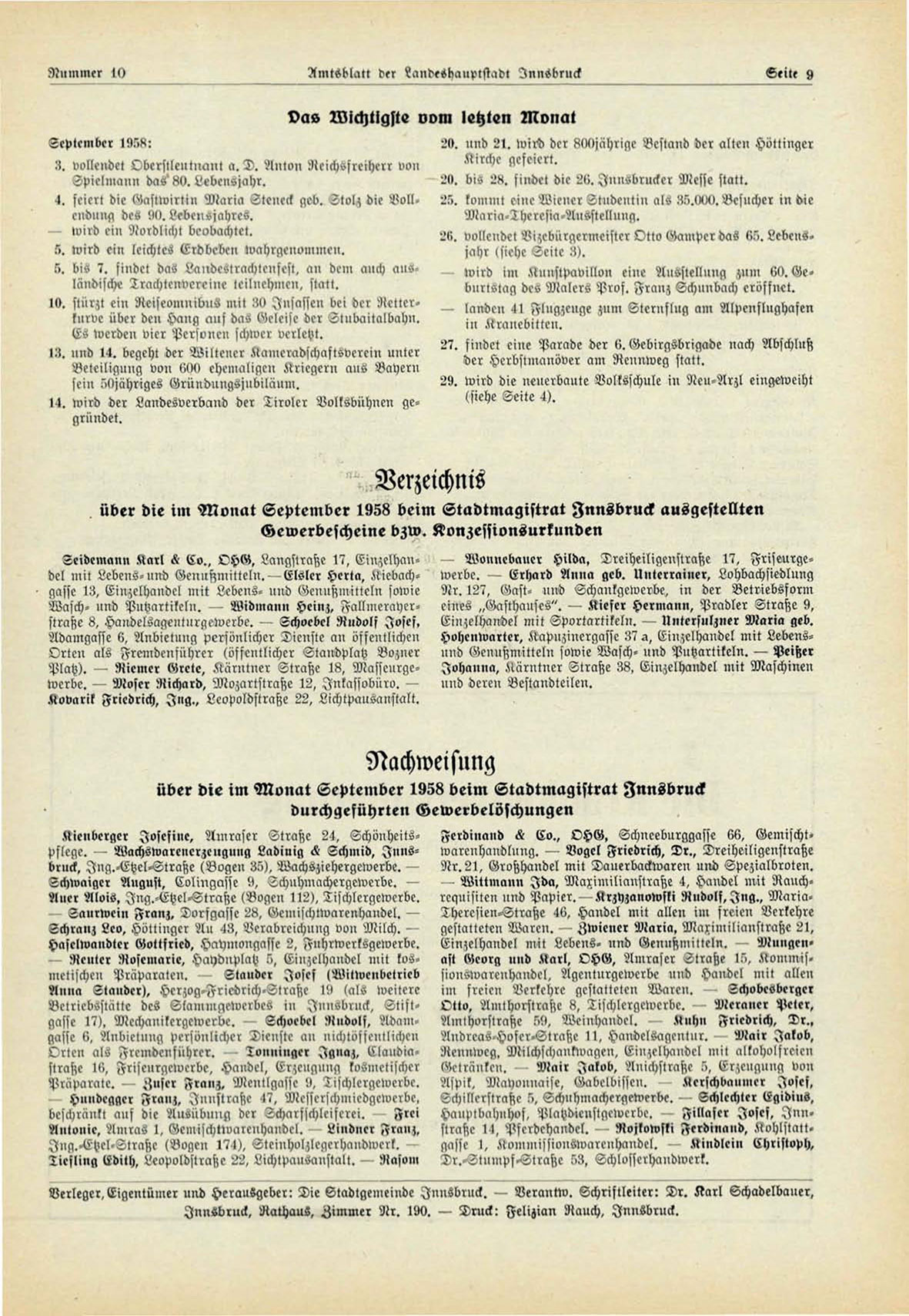 über die im Monat September 1958 beim Stadtmagistrat Innsbruck