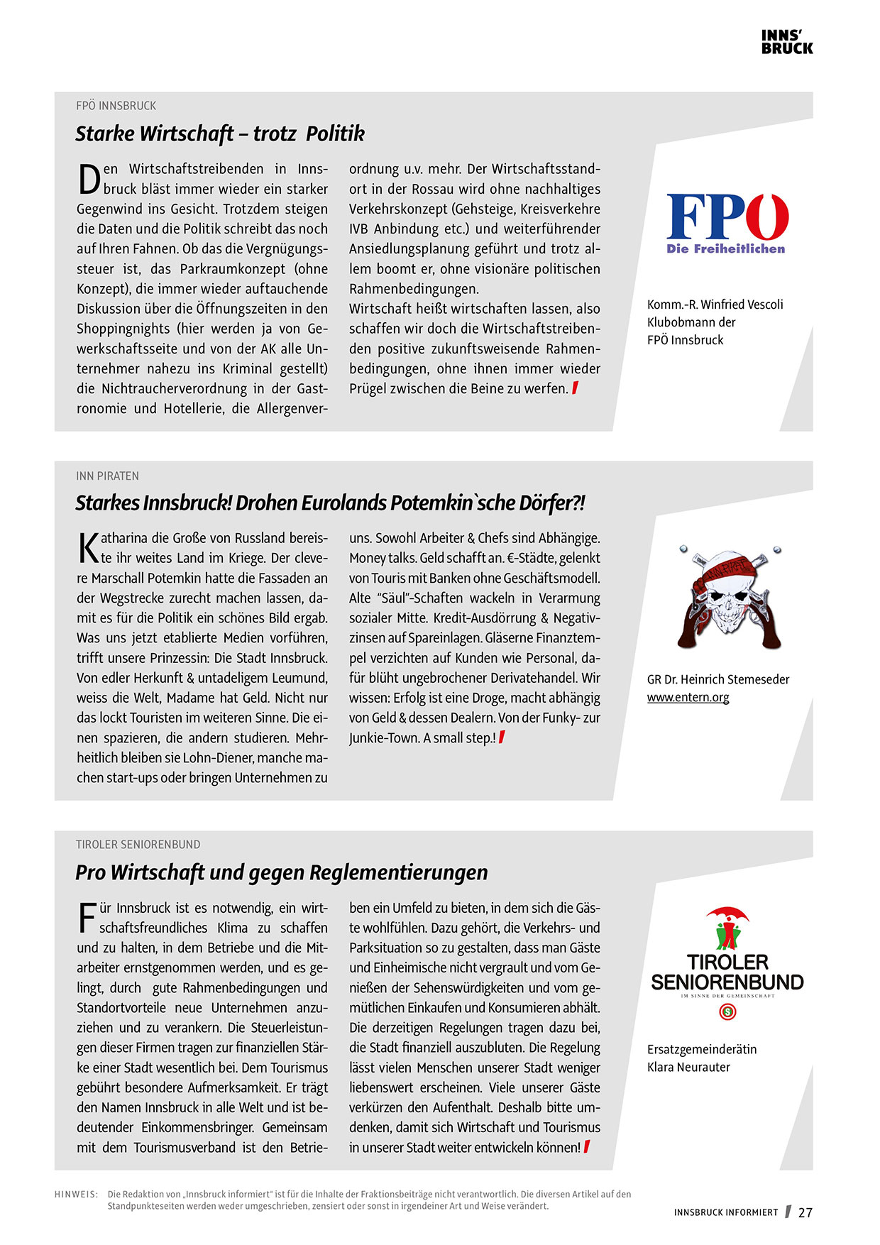 H I N W EI S : Die Redaktion von „Innsbruck informiert“ ist für die Inhalte der Fraktionsbeiträge nicht verantwortlich. Die diversen Artikel auf den