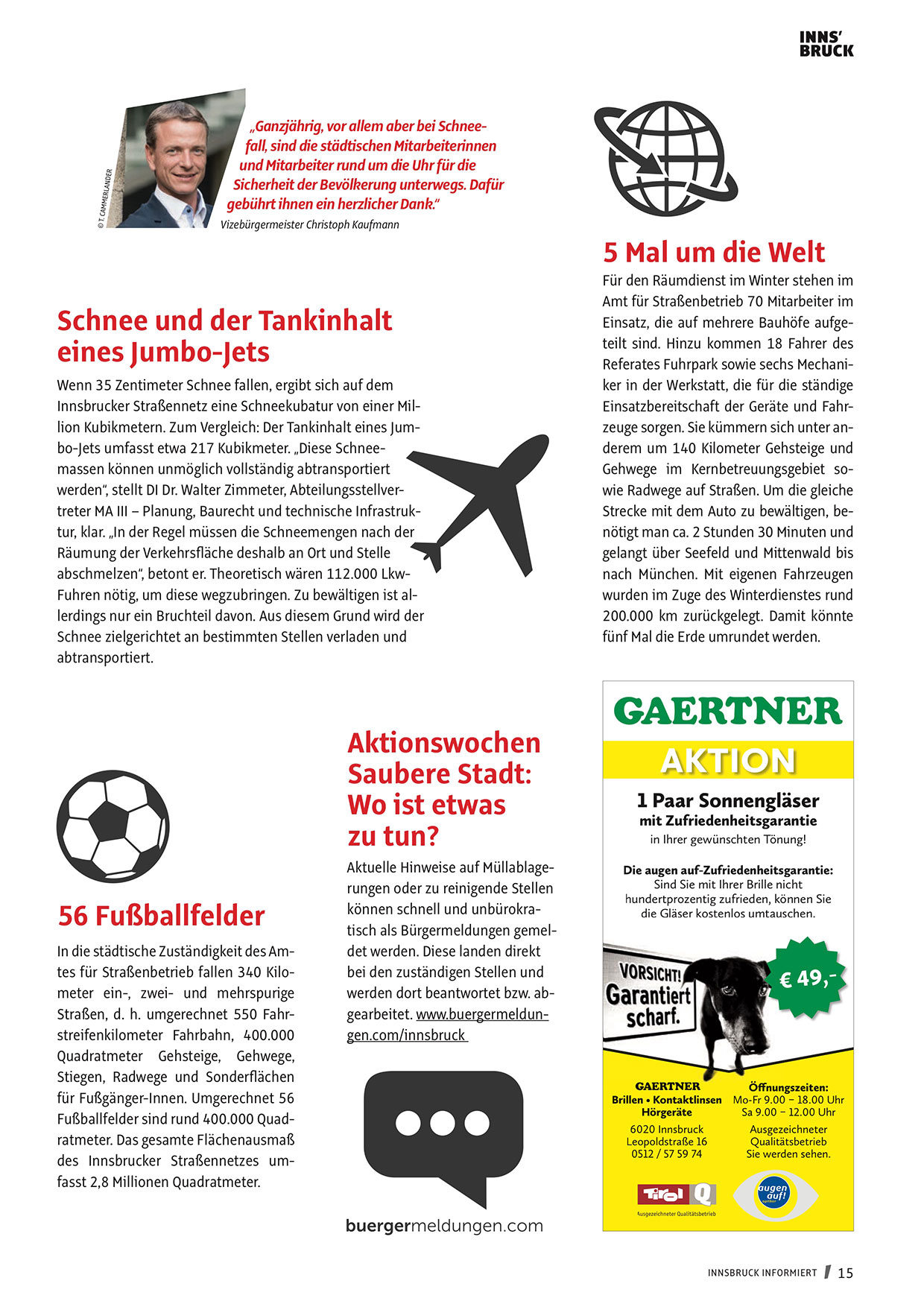 Innsbrucker Straßennetz eine Schneekubatur von einer Million Kubikmetern. Zum Vergleich: Der Tankinhalt eines Jumbo-Jets umfasst etwa 217 Kubikmeter. „Diese Schneemassen können unmöglich vollständig abtransportiert