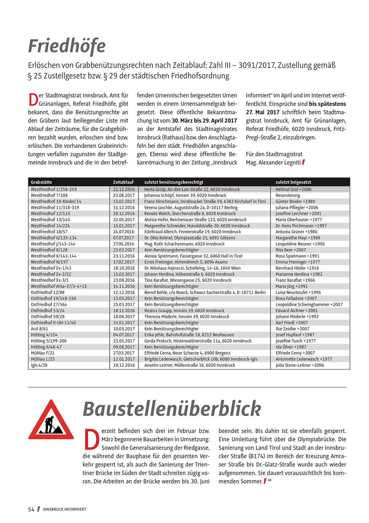 Innsbruck (Rathaus) bzw. den Anschlagtafeln bei den städt. Friedhöfen angeschlagen. Ebenso wird diese öffentliche Bekanntmachung in der Zeitung „Innsbruck