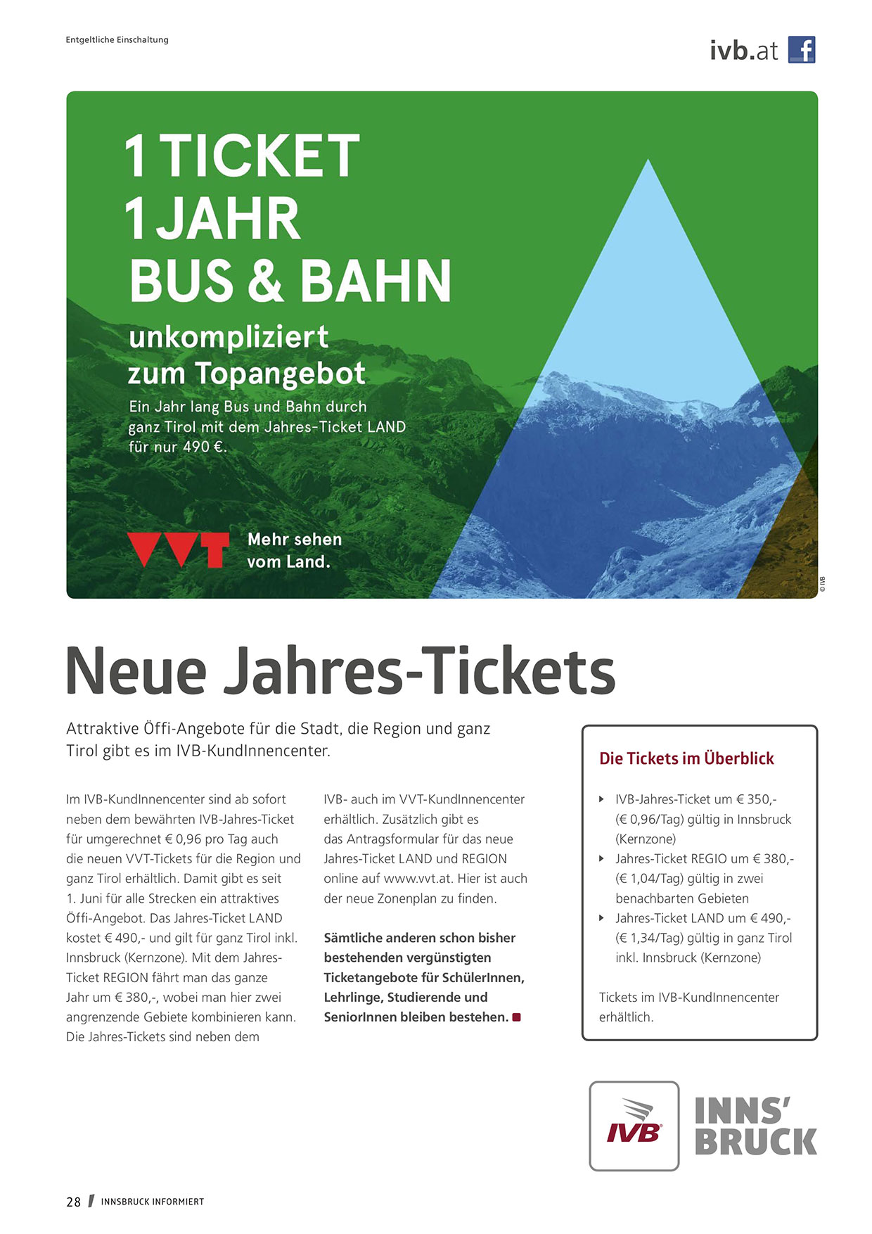 IVB-Jahres-Ticket um € 350,(€ 0,96/Tag) gültig in Innsbruck