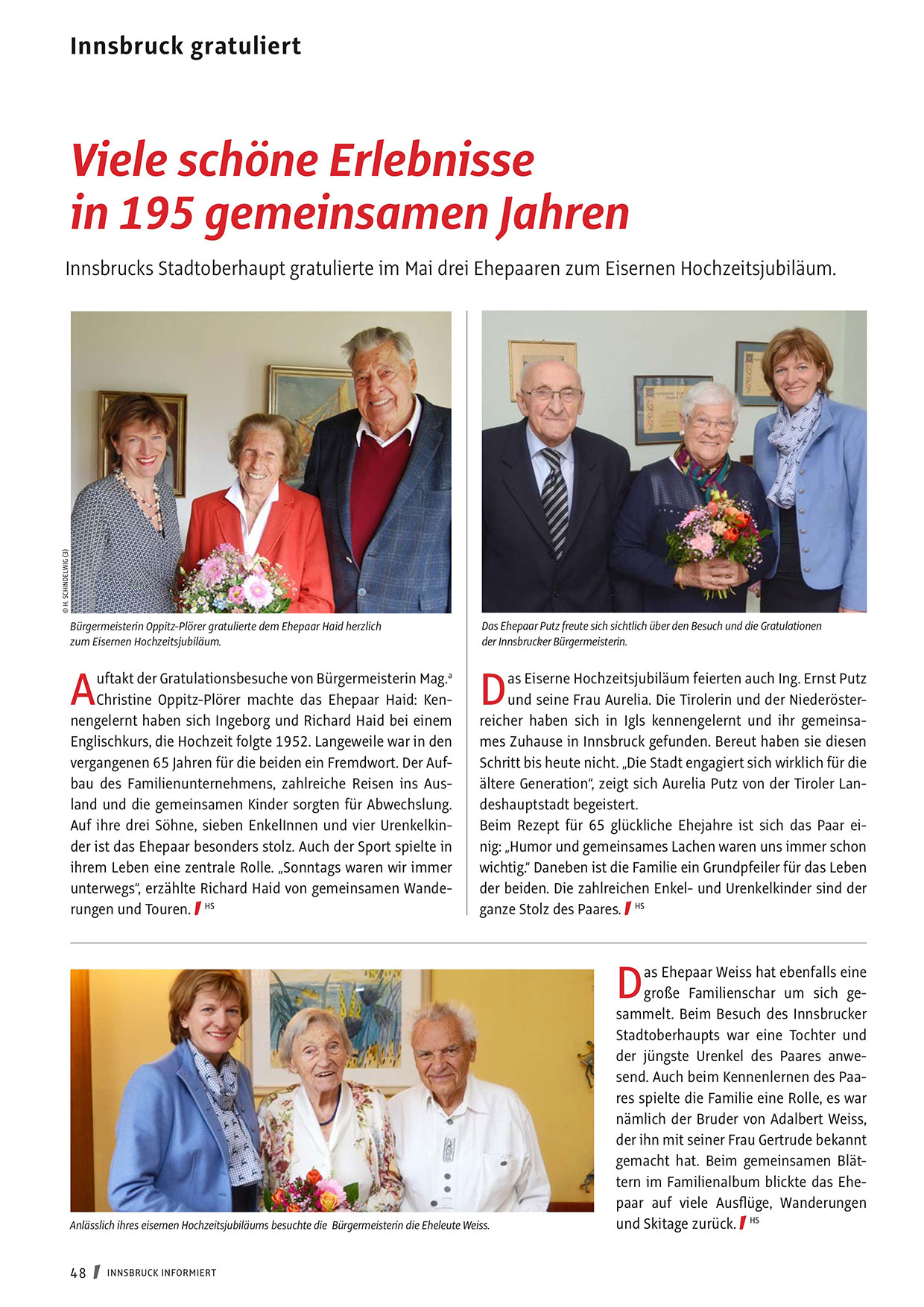 Innsbrucks Stadtoberhaupt gratulierte im Mai drei Ehepaaren zum Eisernen Hochzeitsjubiläum.