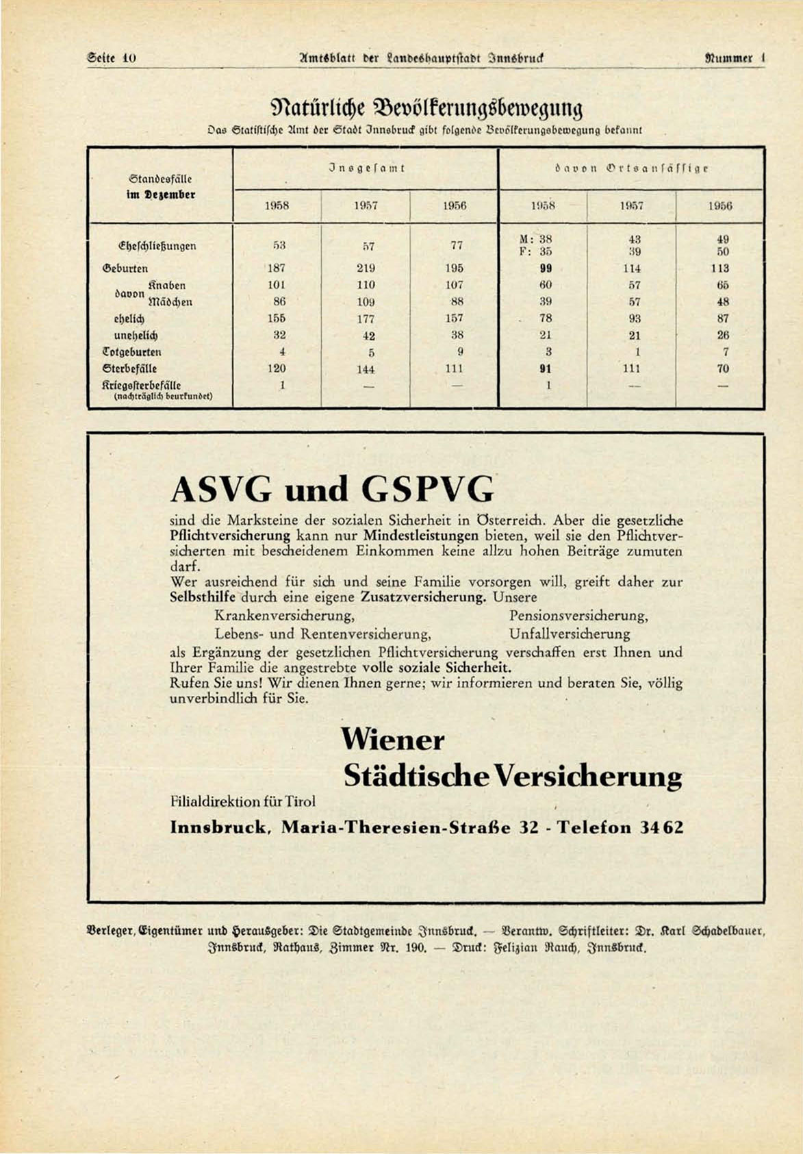 Verleger,Eigentümer unt> Herausgeber: Die Stadtgemeinde Innsbruck.