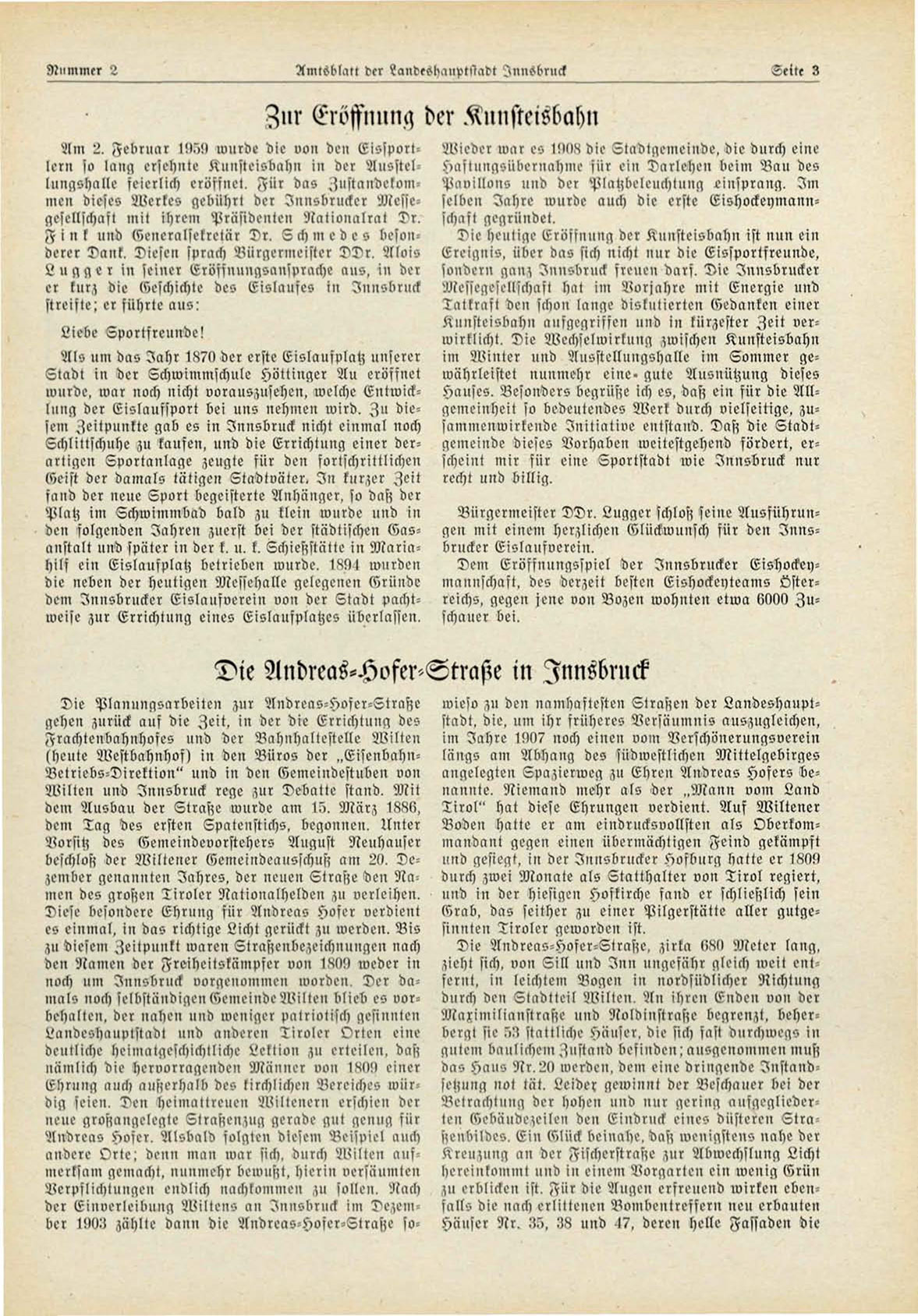 Am 2, Februar N!.",!> wurde die oon den Eissportler» io IlNig ersehnte Kunsteisbahn in der Ausstellungshalle feierlich eröffnet. Für das ^»standetommen dieses Wertes gebiihrt dor Innsbrucker Messegesellschaft mit ihrem Präsidenten ^iationalrat Dr.