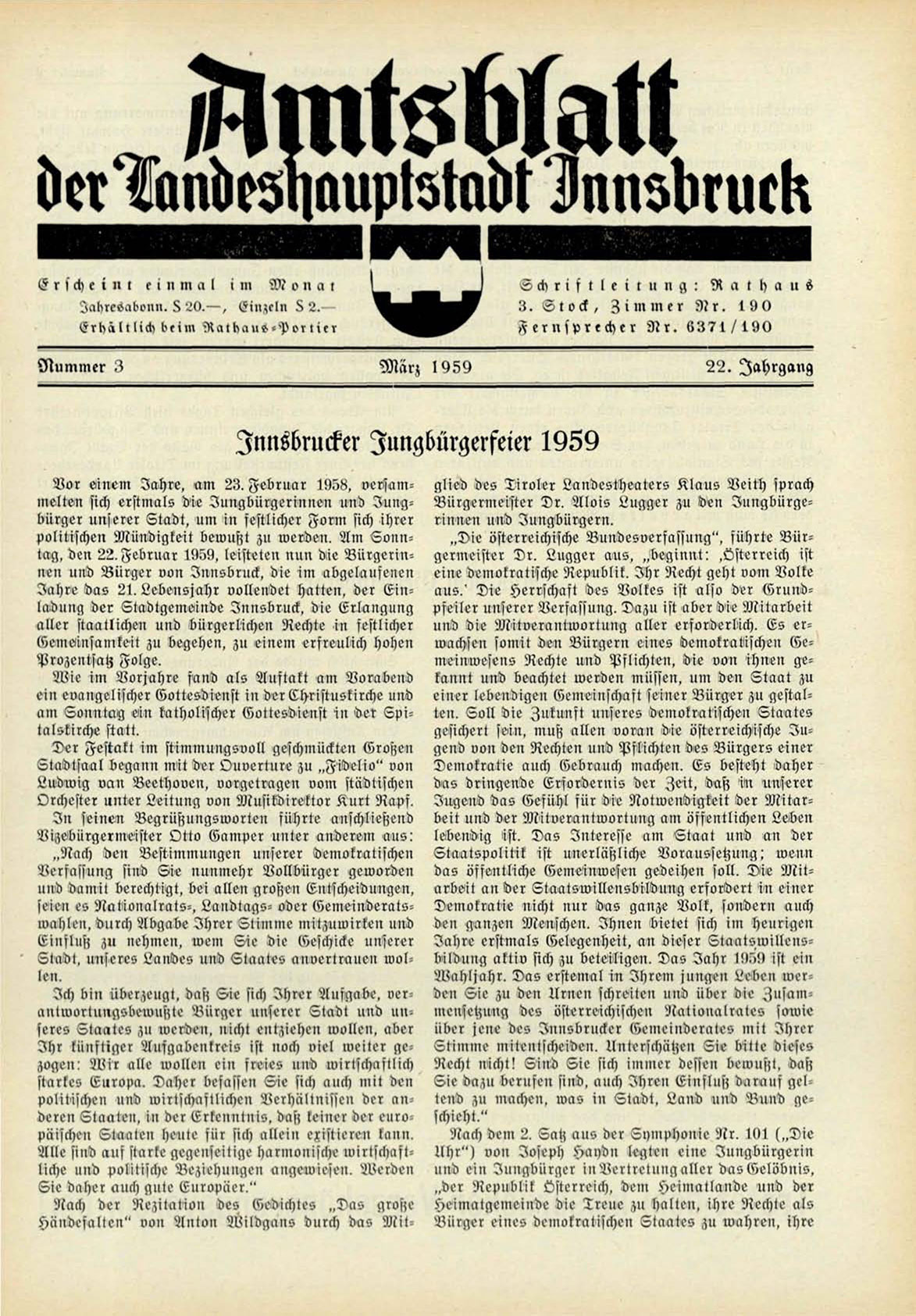 politischen Mündigkeit bewußt zu werden. Am Sonn„Die österreichische Bundesverfassung", führte B ü r tag, den 22. Februar 1959, leisteten nun die Bürgerin- germeister Dr. Lugger aus, „beginnt! ,Österreich ist