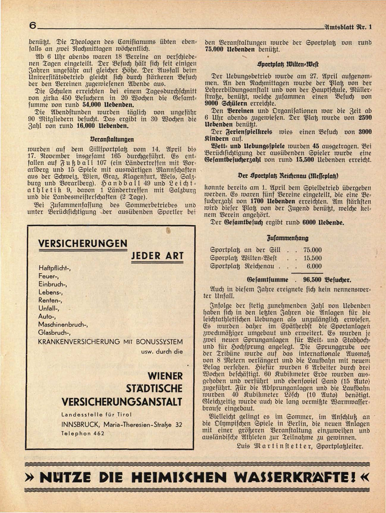 17. November insgesamt 165 durchgeführt. Es entfallen auf F u ß b a l l 107 sein Ländertreffen mit Vorarlberg und 15 Spiele mit auswärtigen Mannschaften