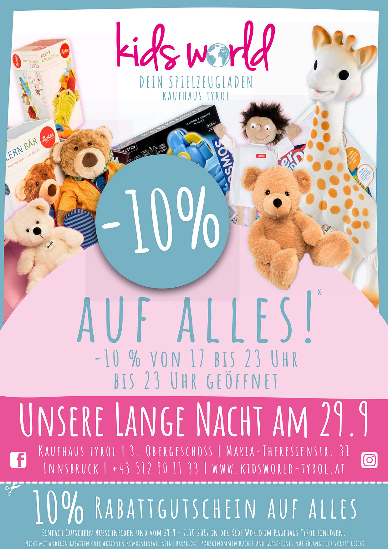 Einfach Gutschein Ausschneiden und vom 29.9 - 7.10 2017 in der Kids World im Kaufhaus Tyrol einlösen.