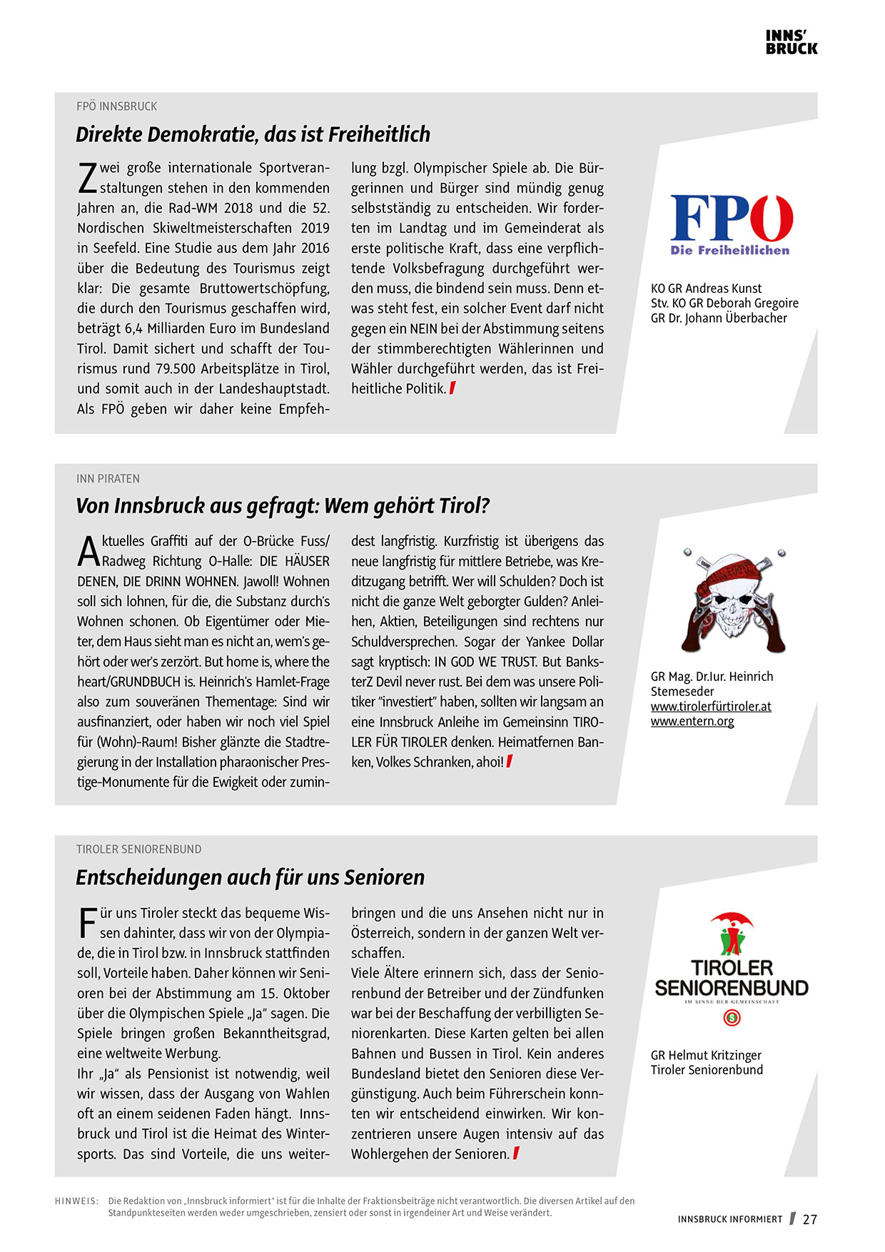 H I N W EI S : Die Redaktion von „Innsbruck informiert“ ist für die Inhalte der Fraktionsbeiträge nicht verantwortlich. Die diversen Artikel auf den