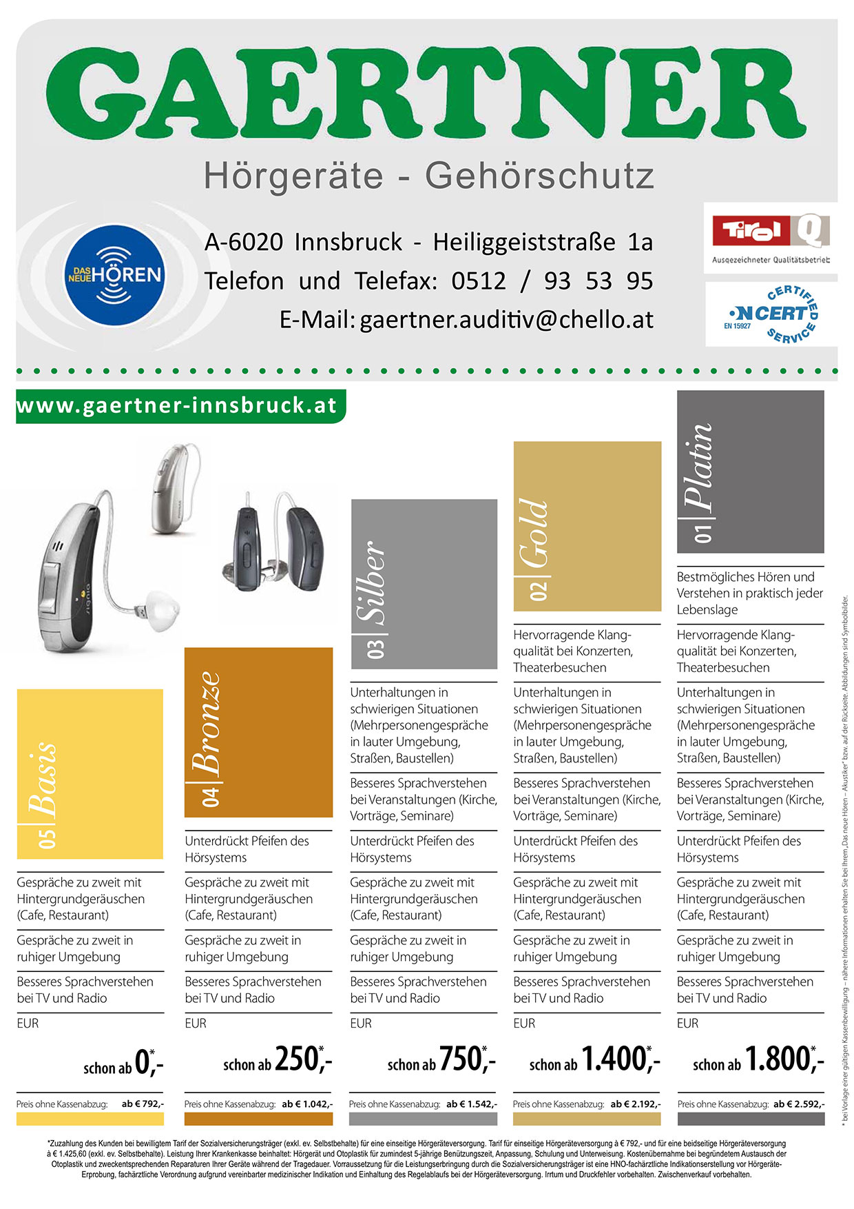 Otoplastik und zweckentsprechenden Reparaturen Ihrer Geräte während der Tragedauer. Vorraussetzung für die Leistungserbringung durch die Sozialversicherungsträger ist eine HNO-fachärztliche Indikationserstellung vor HörgeräteErprobung, fachärztliche Verordnung aufgrund vereinbarter medizinischer Indikation und Einhaltung des Regelablaufs bei der Hörgeräteversorgung. Irrtum und Druckfehler vorbehalten. Zwischenverkauf vorbehalten.